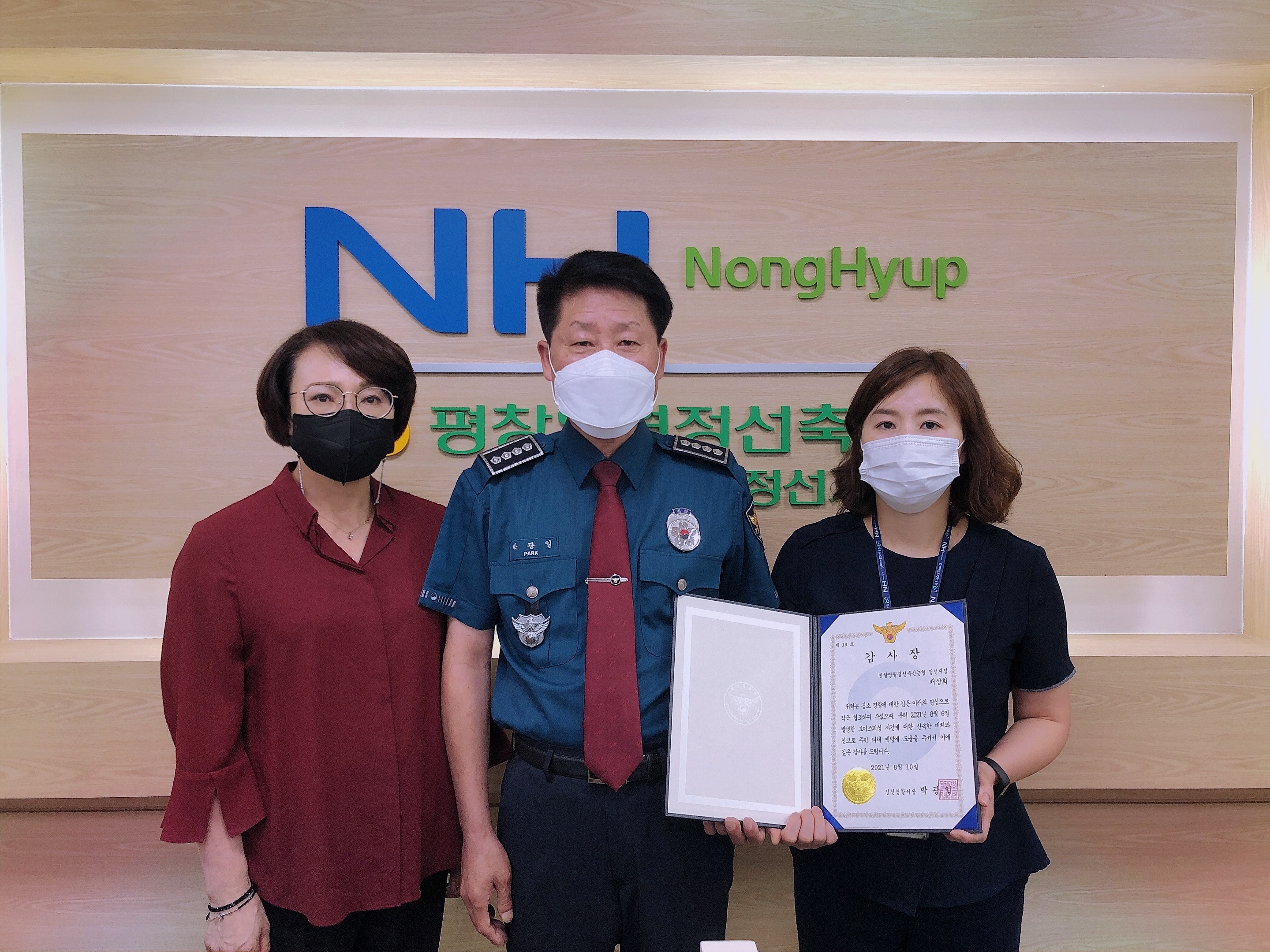 평창영월정선축협(조합장 고광배) 정선지점(지점장 유하경)에서는 지난 8/6일 14시경 85세 전OO님으로부터 현금 28,000,000원을 인출하여 집에 보관하려 한다는 고객의 요청을 과장보 채상희 직원이 현명하게 대처하여 피해예방과 고객의 소중한 자산을 보호할 수 있었던 부분을 높이사 정선경찰서(서장 박광일)에서 8/10일 감사장을 수여하였다.