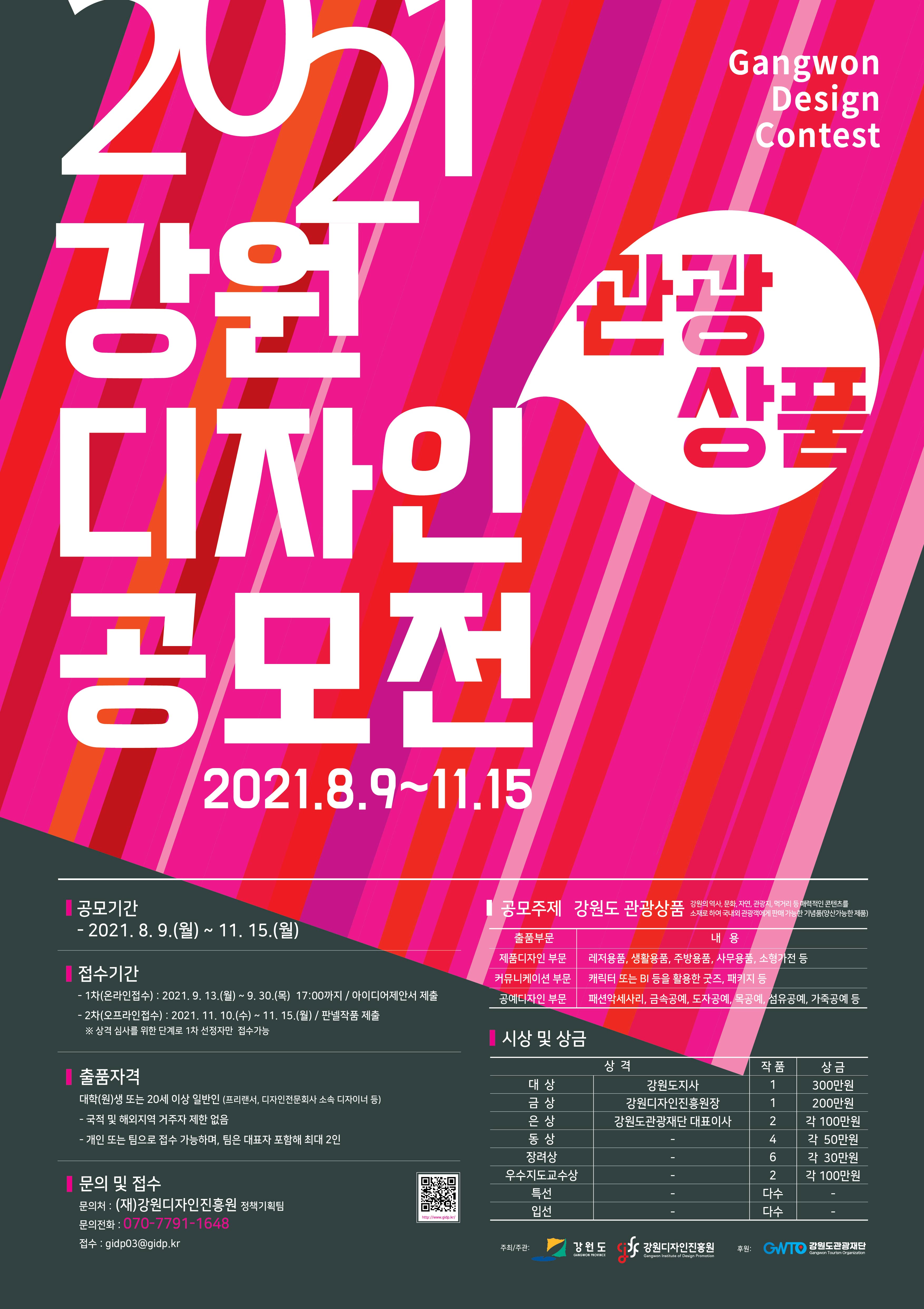 강원디자인진흥원(이하 진흥원, 원장 최인숙)은 코로나 19로 인해 어려움을 겪는 강원도 관광산업에 활기를 부여하고자 ‘2021년 강원 디자인 공모전’을 개최한다.