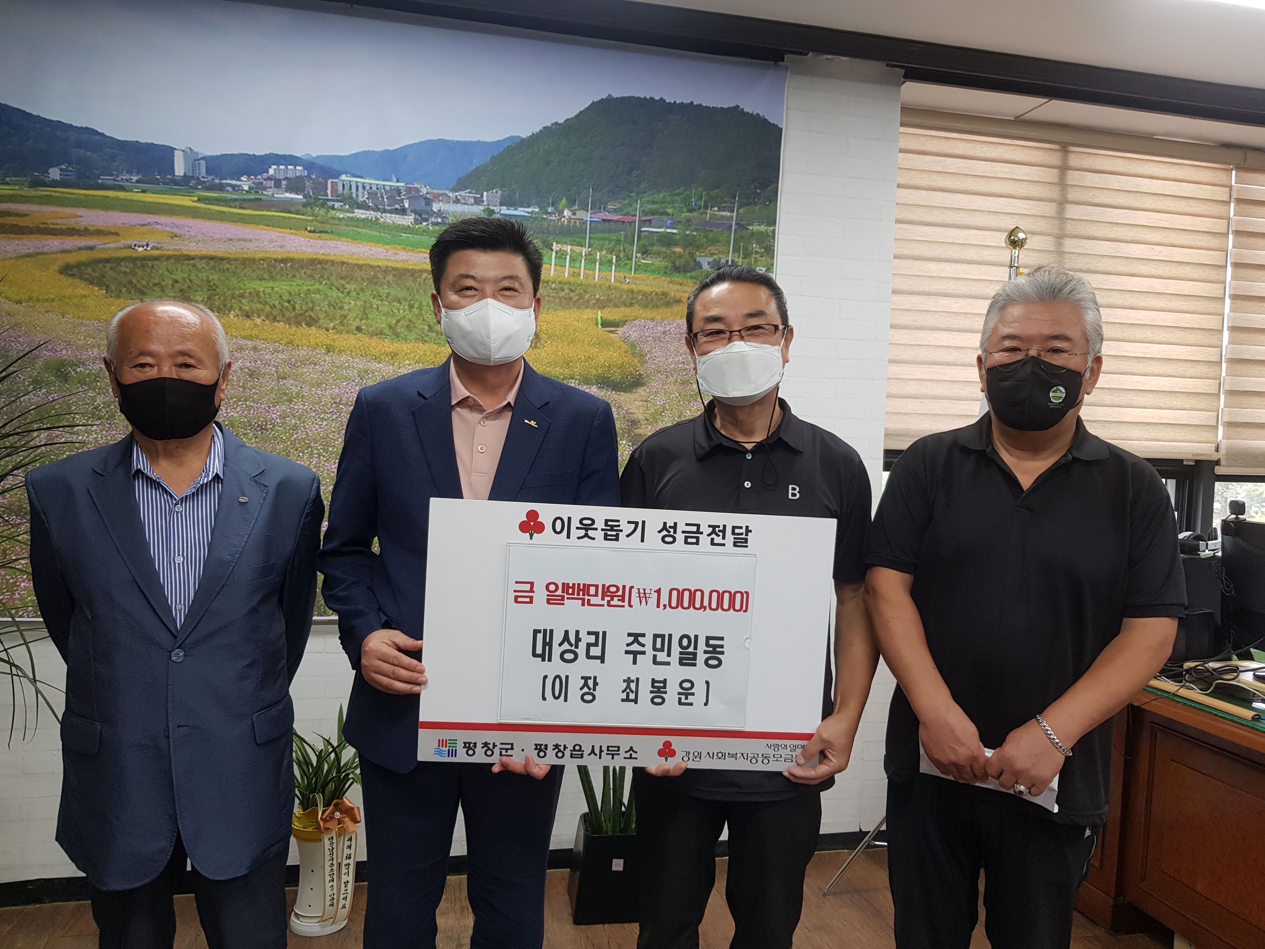 평창읍 대상리(이장 최봉운) 주민들이 지역의 어려운 이웃들을 위해 사용해 달라며 평창읍(읍장 이용배)에 성금100만원을 전달했다.