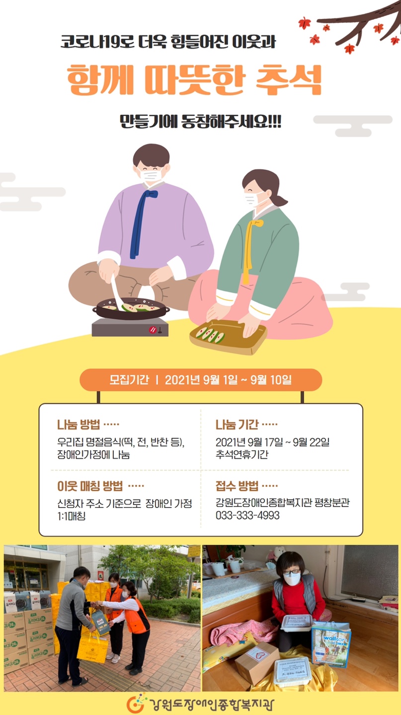 '코로나19는 사회곳곳에 변화를가져오고,그 변화는 사회 복지현장에도 일어나고있습니다 대면이 기본인 복지현장에 집합대면이 중단되고 비상운영체계로 변화하여 추석명절에도 홀로계실 장애인가정 지원에 어려움이있습니다. 우리복지관에서는 명절에 홀로계실 장애인가정에 이웃이 가정에서 만든 명절음식을 나누는 이웃과 "함께 따뜻한 추석" 진행합니다. 따뜻한 관심과 동참부탁드립니다.