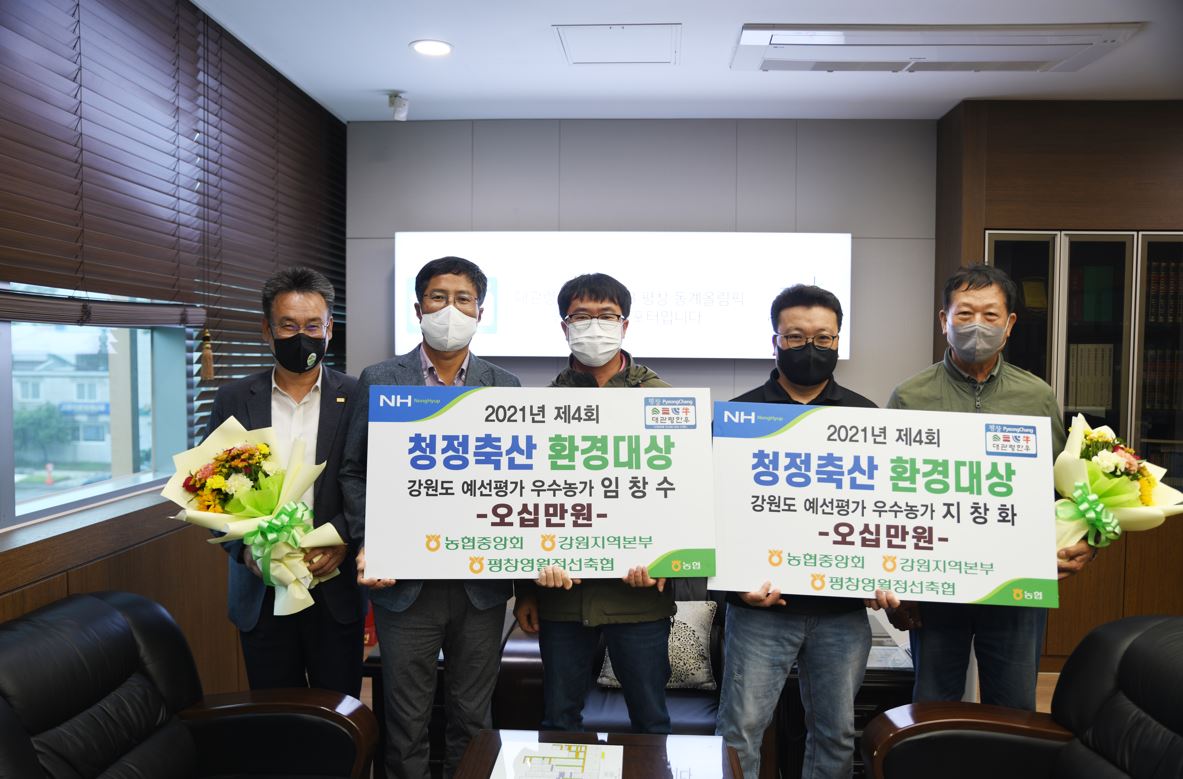 청정축산을 선도하고 국민과 함께하는 친환경 축산 구현을 목적으로 매년 실시하는 청정축산 환경대상 본선에 평창 대웅목장(대표 임창수, 미탄면)과 창화목장(대표 지창화, 평창읍)이 선정되어 농협중앙회 강원지역본부에서 지역본부장상(표창장) 및 부상(50만원)을 수여합니다.