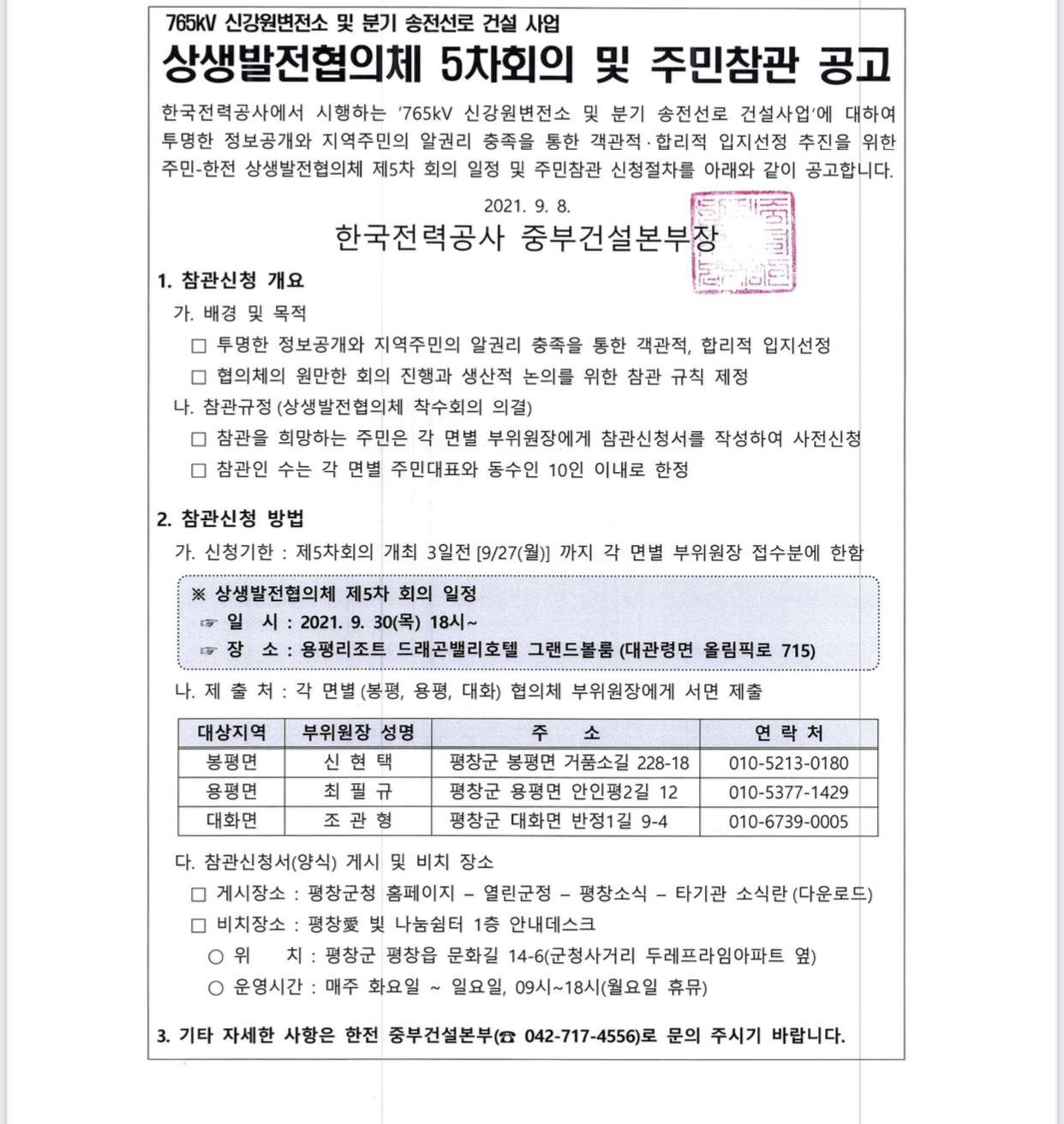 (공고) 765KV 신강원변전소 및 분기 송전서로 건설사업 상생발전협의체 5차회의