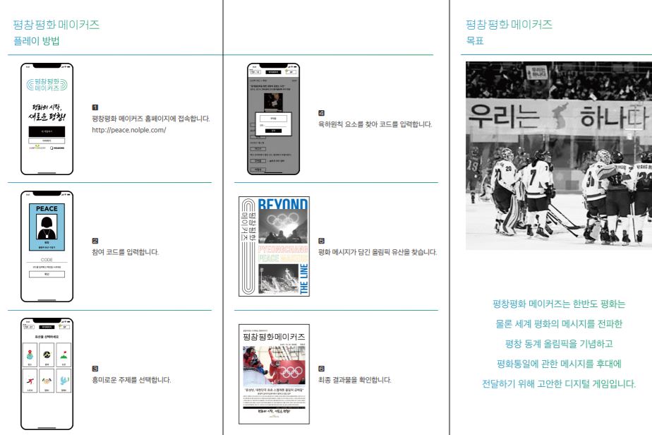2021 평창 평화주간평창 평화메이커즈는 전시체험공간을 조성하고 핸드폰 어플과 연동하여 온오프라인을 연계하는 빅게임 콘텐츠로, ‘올림픽에서 찾아보는 평화이야기라는 주제로 참가자들은 체험실 안에서 평화와 관련한 이야기를 찾아 완성해 기사로 제작하는 유산수집가가 되어볼 수 있다.