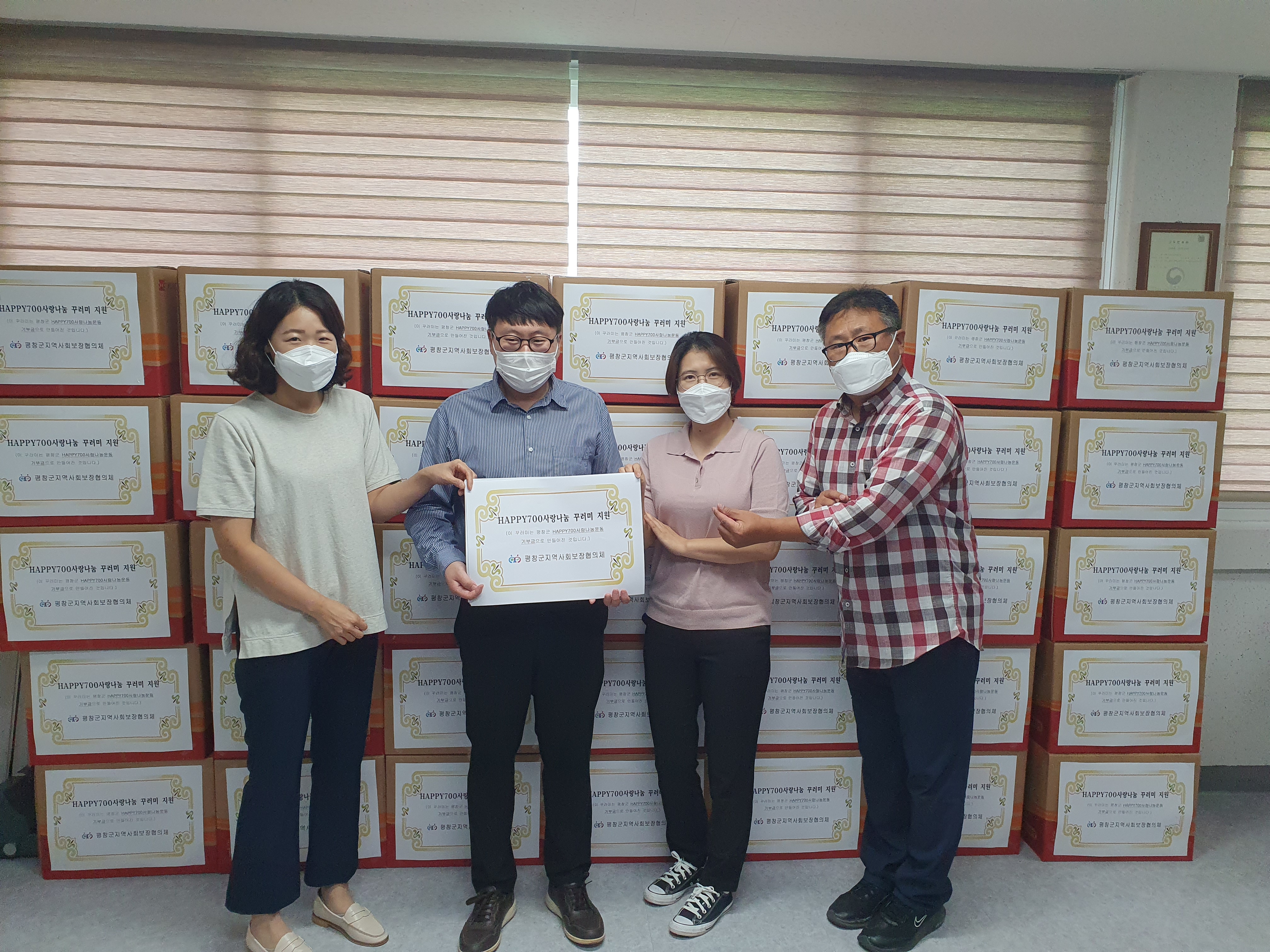 HAPPY700 사랑나눔 꾸러미는 지역 특산물인 건조 산양삼, 오디국수를 포함하여 햇반, 곰탕, 장조림, 견과류, 홍삼캔디, 누룽지, 김, 산양삼 두유 등 총 10종으로 구성되어 있는 꾸러미로, 복지사각지대의 어려운 가정에 전달된다.