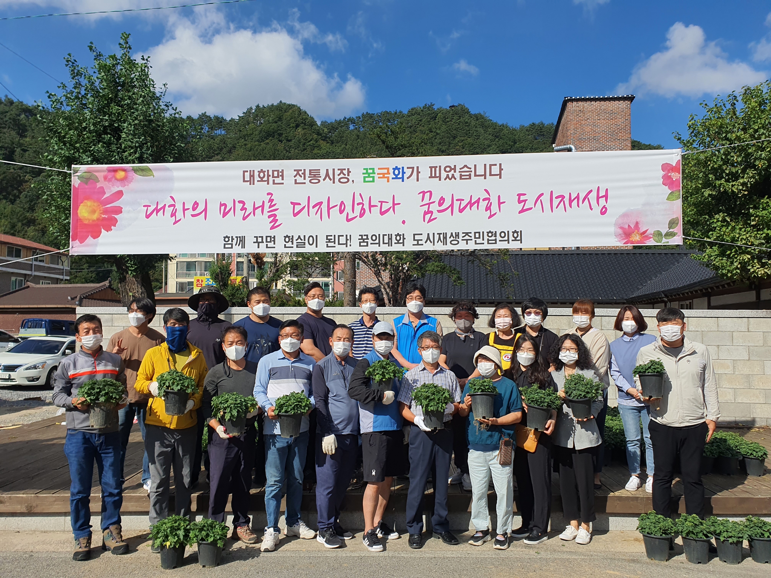 김흥선 도시재생협의체 회장은 “행사에 참여해주신 대화면장님을 비롯한 사회단체장님들과 주민들께 진심으로 감사드린다.”며, “코로나19로 추석연휴도 예전과 같이 활기차지 않겠지만 오늘 설치한 국화 꽃화분이 지역주민께 조금이나마 위로가 되었으면 좋겠다.”고 전했다.