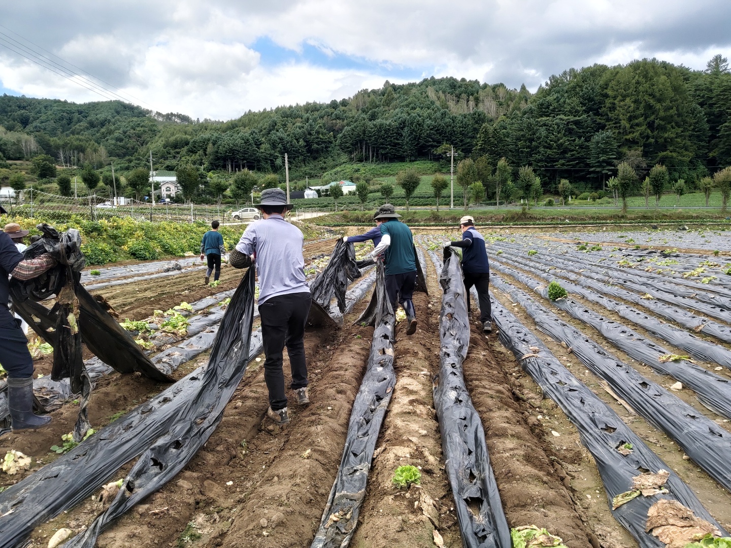 이날 면사무소 직원들과 이장들은 해당 농가의 양상추 밭 2,500평의 폐비닐 걷기를 돕고, 작업 후에는 농가의 애로사항을 듣고 격려하는 시간도 가졌다.