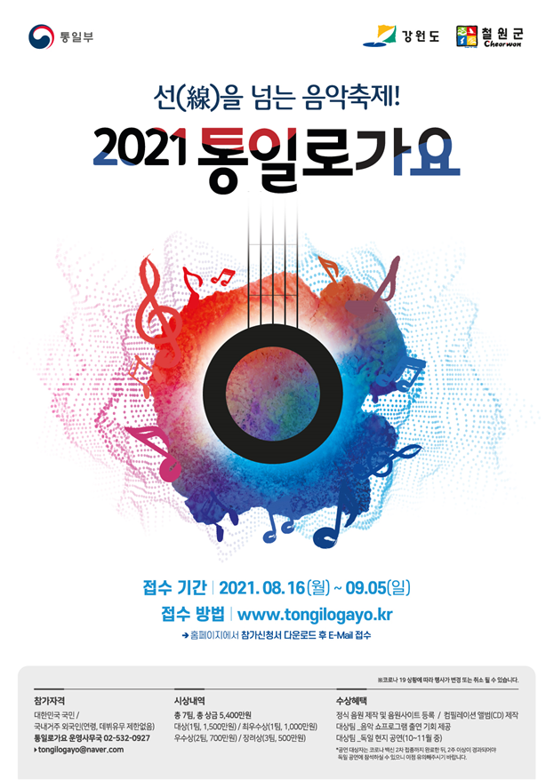 통일부와 강원도는 9월 28일(화) 철원군 노동당사에서 ‘선(線)을 넘는 음악 축제! 2021 통일로가요’결선공연을 개최한다. 이번 가요제는 통일 시대의 주역인 2030세대들에게 음악을 통해 공감대를 형성하는 장을 제공하고자 마련했다.
