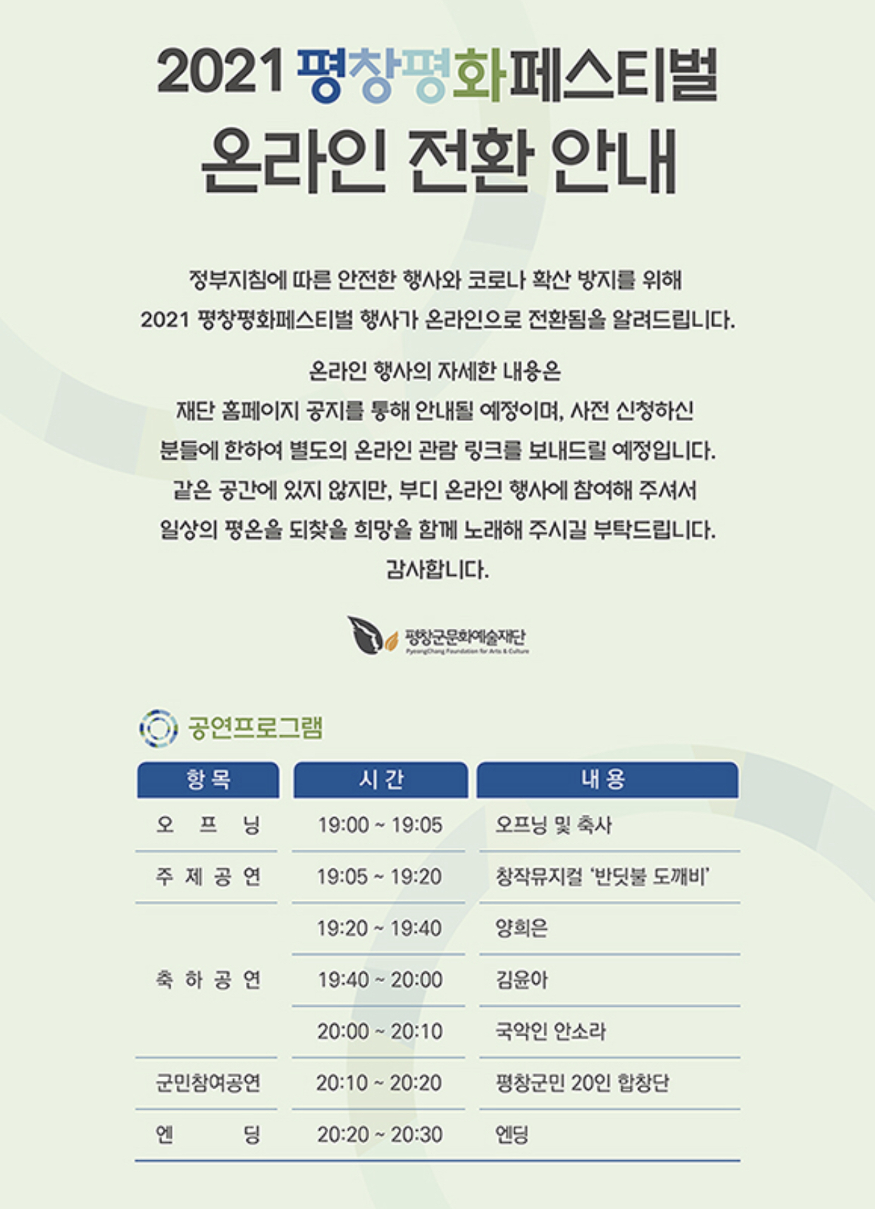 평창평화페스티벌이 코로나19확산으로 인하여 온라인으로 전환되었습니다.