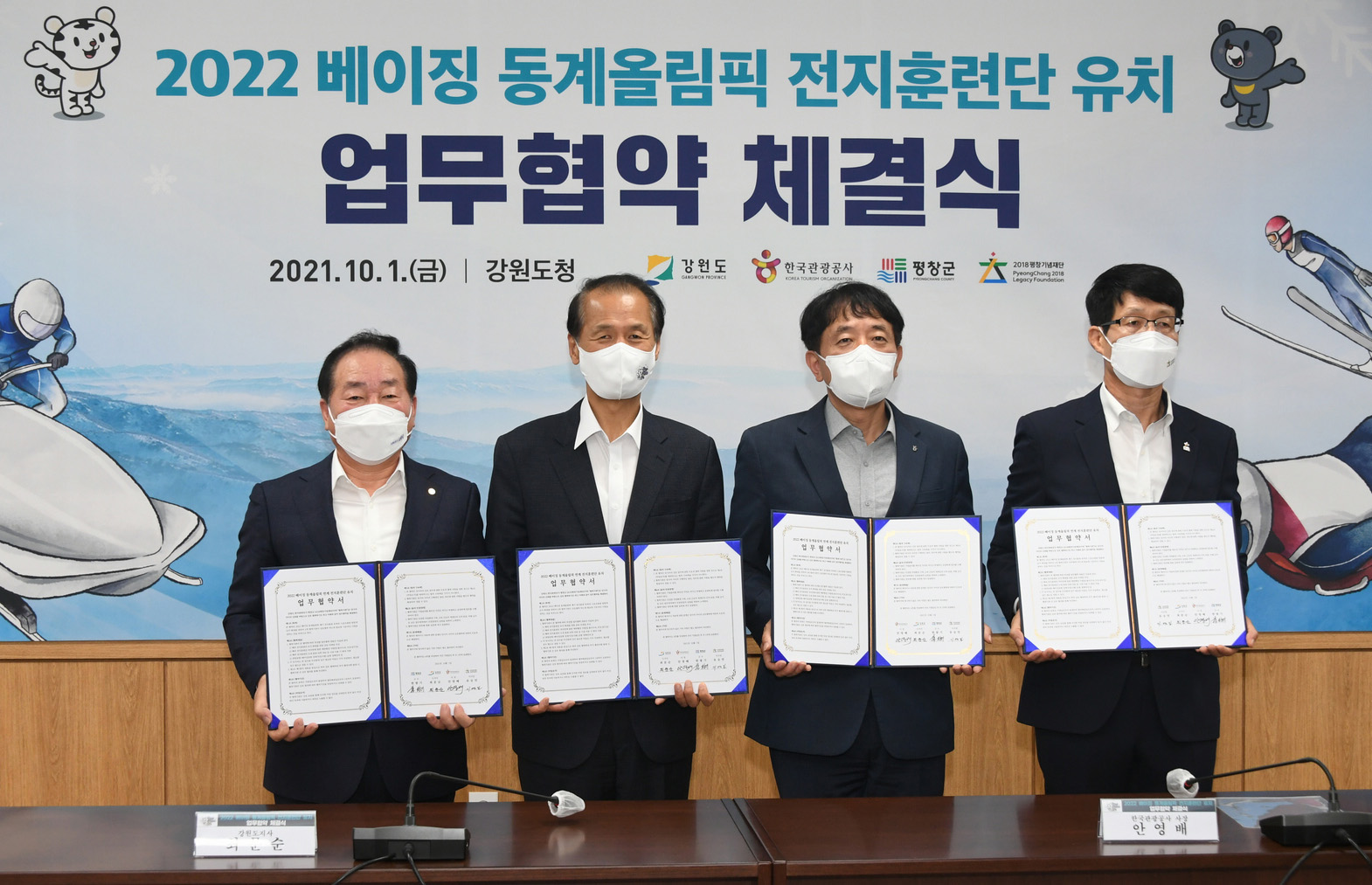이날 업무협약식에는 한왕기 평창군수, 안영배 한국관광공사사장, 최문순 강원도지사, 장진상 2018평창기념재단 사무처장이 참석하였으며, 협약은 2022베이징동계올림픽(`22.2.4~20) 및 패럴림픽(`22.3.4~13) 연계 해외 선수 전지훈련단 유치와 직전 개최지로서의 2018평창동계올림픽 유산 활용, 스포츠관광 목적지로서의 한국의 위상을 높이고 국제 스포츠도시를 육성하는데 그 목적을 두고 있다.