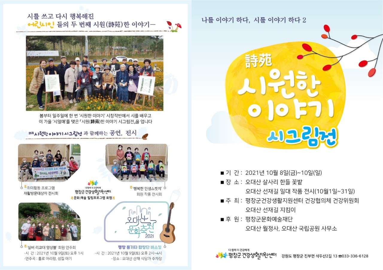 이번 전시회는 지난해에 이어 두 번째 열리는 시그림전으로 평창군 관내 거주하는 어르신 20명이 봄부터 일주일에 한 번 시원(詩苑)한 이야기시창작반에서 시공부를 하고 시쓰기를 통해 창작한 동시 40점을 가을정취와 함께 만끽할 수 있도록 오대산 황화코스모스 야외 꽃밭에서 전시하고 있으며, 황화코스모스 꽃밭에는 지역 건강협의체 건강위원 단체가 직접 자작나무로 만든 포토존 의자를 만들어 놓아 관람객들에게 좋은 추억을 남길 수 있게 준비했다.