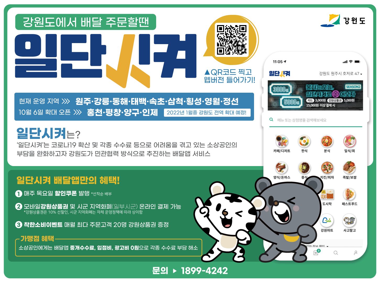 강원도형 배달앱 일단시켜는 중개수수료, 입점비, 광고료가 ‘0인 배달앱으로 코로나19로 인해 어려움을 겪고 있는 소상공인들의 새로운 판로 개척을 위해 개발된 강원도형 공공배달앱이다.