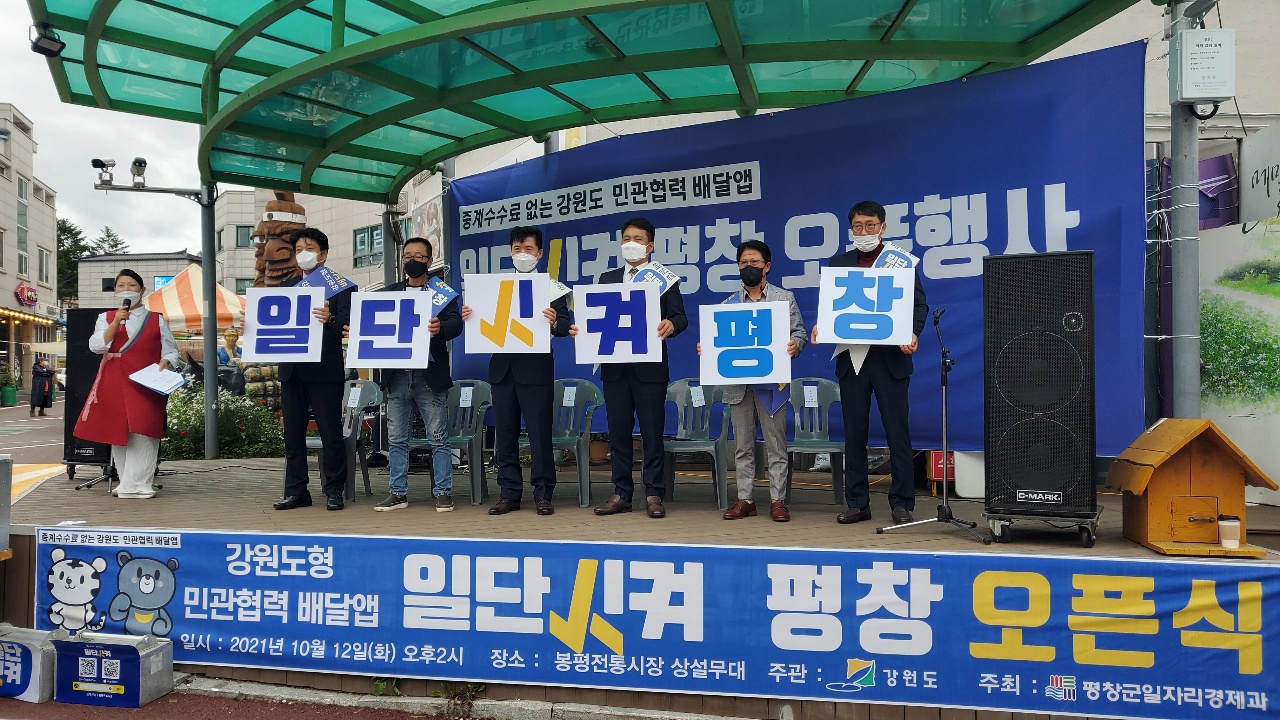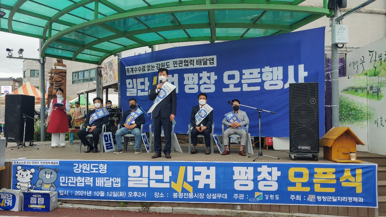 이에 따라 군은 오는 12, 봉평전통시장에서 일단시켜오픈식을 통해 소비자들에게 본격적인 배달앱 서비스 시작을 알렸다., 이날 행사에는 평창군문화관광해설사 최일선씨의 사회로 평창군 내외 여러 기관들의 인사들이 참석하여 축하 공연 및 쿠폰 발행, 거리캠페인 등 각종 행사를 진행했다. 이주웅 군의원, 장연규 봉평면장, 최창선 평창군번영회장, 이천기 사무국장, 이은미 자원봉사센터장, 김재봉일자리경제과장 등 지역 인사들이 참여해 축하하는 자리를 가졌다. 특히, 자원봉사센터(이은미 센터장) 난타팀이 축하 공연을 펼쳐 많은 호응을 얻었다.