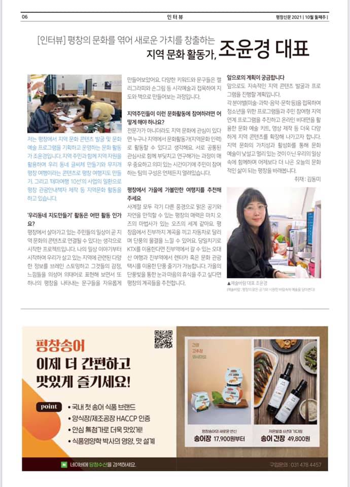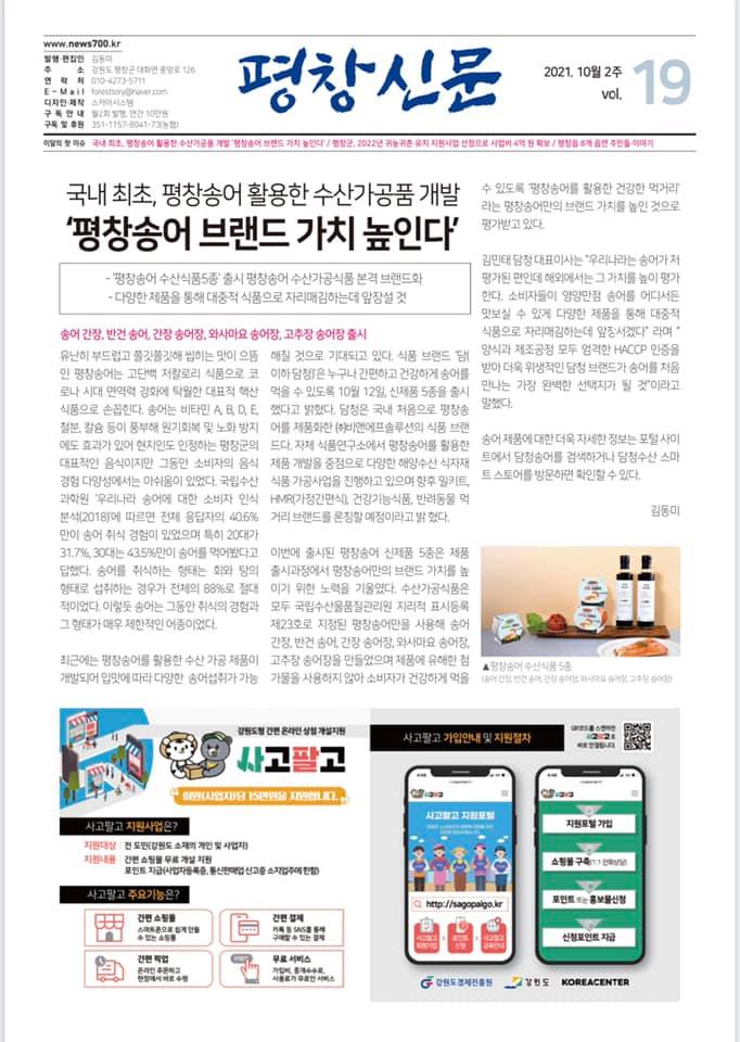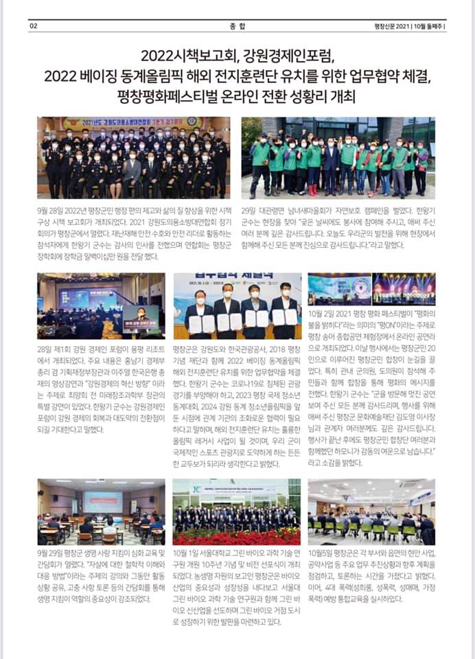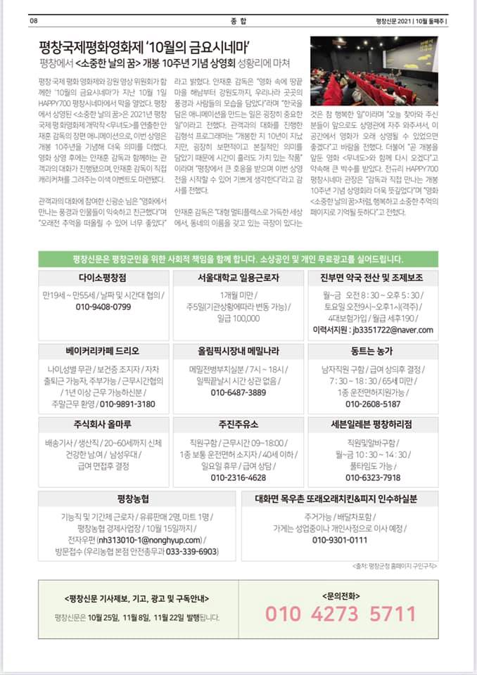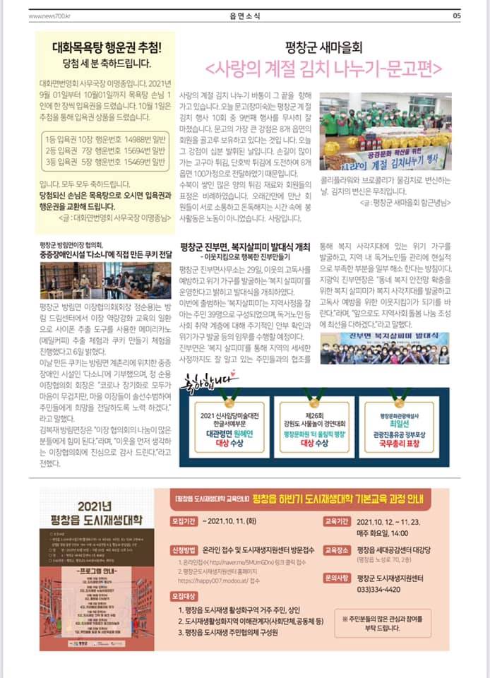 10월2주 평창신문 웹으로 올려드립니다. 평창신문 밴드, 페이스북 등에서 사진을 확대하면 크게 보실 수 있습니다. 8개면 밴드에 올려주시는 지역분들의 이야기와 통합밴드에 올려주시는 글을 평창군 8개읍면 주민들의 이야기로 계속 올려드릴 예정입니다. 지역분들의 살아가는 이야기를 많이 올려주세요. 평창신문 통합밴드에는 누구나 글을 올리실 수 있습니다. 지면을 구독해 지면으로 받아보고 싶으신 분들은 평창신문으로 연락주세요.