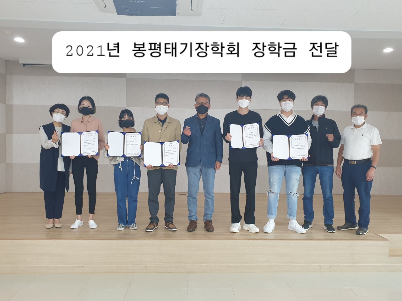 10월 5일 2021년 봉평태기장학회 장학생들에게 김환성 이사장을 비롯해 상임이사(김형일), 임원들과 같이 장학증서를 코로나 19 방역수칙을 준수한 가운데 전달하였습니다. 많은 분이 이 학생들이 열심히 공부하며 생활할 수 있도록 많은 관심과 격려 부탁드립니다. <글: 봉평면 김준래 님>