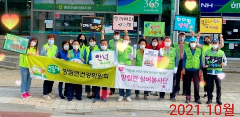 안녕하세요. 방림면 건강위원회 사무국장 송은정 인사드립니다~♡ 비 소식이 잡혀있어서 오늘 오전에 내가 먼저 인사하기 캠페인이 있는데 어쩌나 걱정을 했는데 걱정한 게 무색할 정도로 날이 쨍하고 해님이 반겨주네요^^오늘 오전에 방림 실버 봉사단과 저희 방림 건강위원회 함께 저번 5월에 이어 10월도 뭉쳤습니다♡ 방림초등학교에 다니는 저희 아이들이 몇 달 새 또 많이 컸네요^^ 저희가 손 흔들고 인사하는 거 보곤 환하게 웃음 지으며 지나가신 많은 분이 소소하게나마 저희 방림 주민분들로 인해 행복한 하루를 보내셨으면 하는 바램을 가져봅니다^^