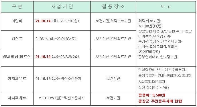 평창군민이라면 만65세 이상은 12일부터 평창군보건의료원 및 보건지소·진료소와 관내 위탁의료기관 13곳에서 접종이 가능하며, 임신부는 임신주수에 상관없이 산모수첩 등으로 증빙 시 무료접종이 가능하고, 관내 위탁의료기관은 홈페이지 및 예방접종도우미사이트에서 확인할 수 있다.