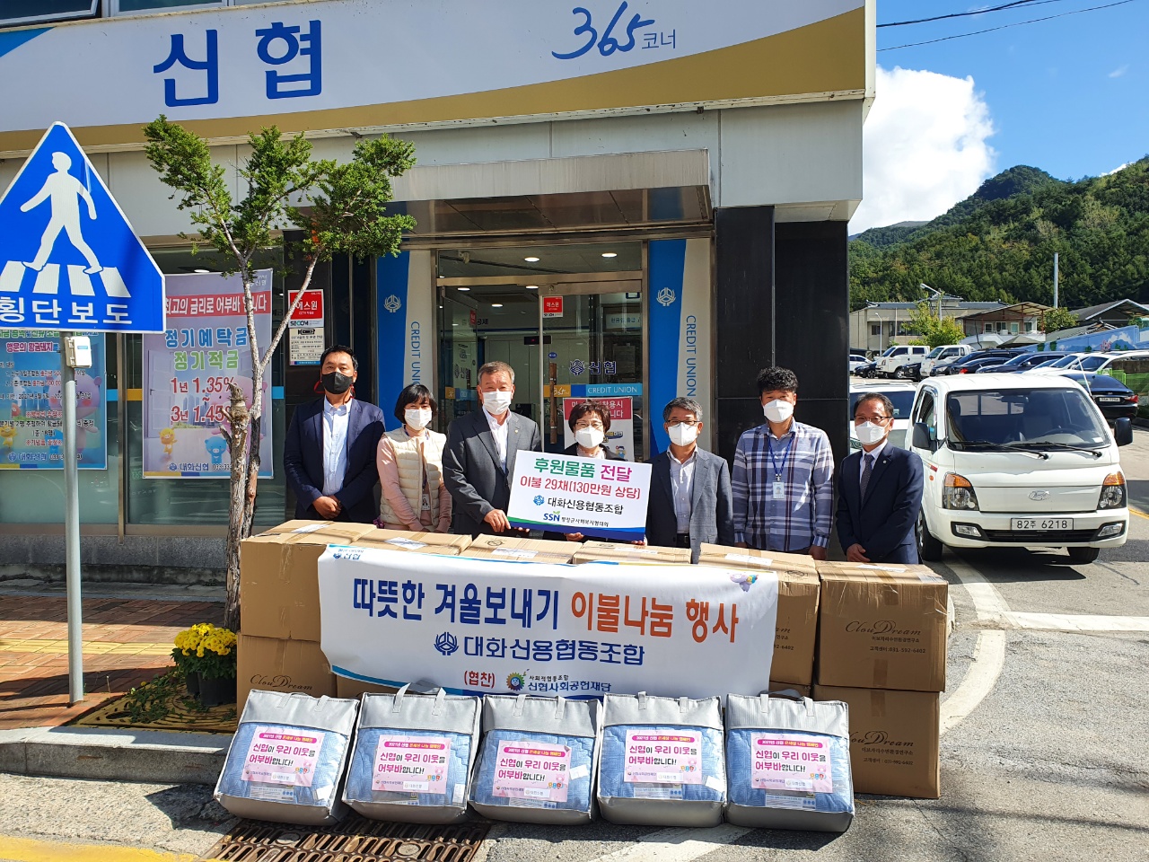 이번 기부는 2021년도 신협중앙회 사회공헌재단에서 2021년 따듯한 겨울나기 캠페인의 일환으로 대화신협이 이불 29채(130만원 상당)를 전달받아 평창군 사회복지협의회와 대화면사무소에서 추천받은 장애인과 한부모가정 등 어려운 이웃에게 기부하였다.