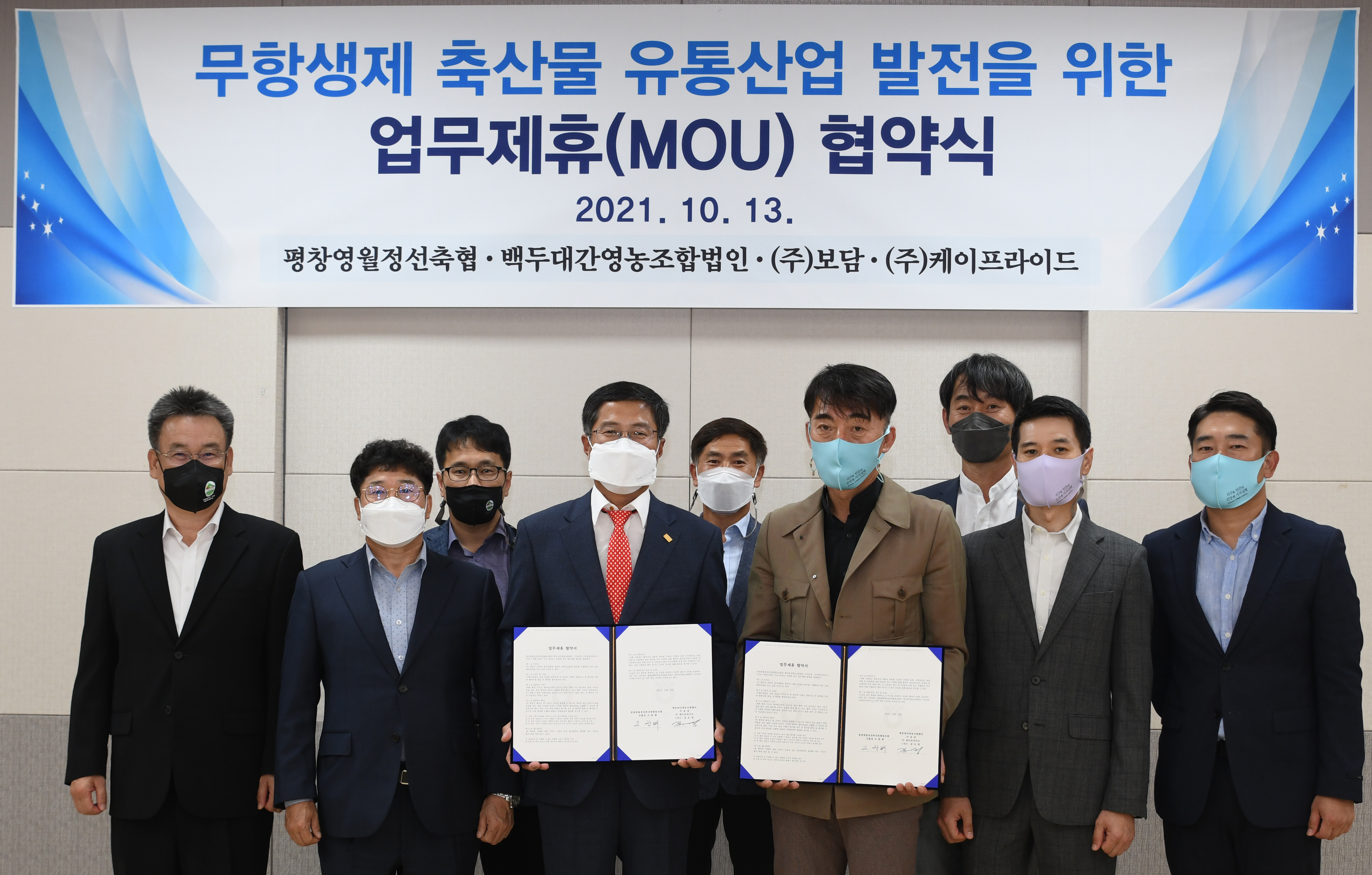 지난 (10/13) 오후 3시에 조합 본점(강원도 평창군 평창읍 백오로 9) 종합청사 회의실에서 4자가 모여 양해각서(MOU) 서명을 통해 무항생제 축산물 업무제휴 협약식을 체결했다.
