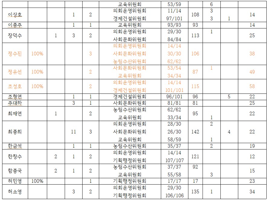 출석률이 100%이면서 2개 이상의 운영위에서 활동하면서 20건이상 안건발의를 한 의원은 김수철(화천군), 김형원(동해2), 반태연(강릉3) 의원인 것으로 나타났다. 김수철의원은 사회문화위원회, 경제건설위원회에서 활동하며 총 96회의 회의에 100%출석했고 총 20회의 안건을 발의했다. 김형원(동해2)의원은 의회운영위원회, 경제건설위원회의 회의 131회에 100% 출석했고 총 24회의 안건을 발의했다. 반태연(강릉3) 의원은 사회문화위원회, 교육위원회의 회의 총 88회에 100% 출석했고, 총 22회의 안건을 발의했다.