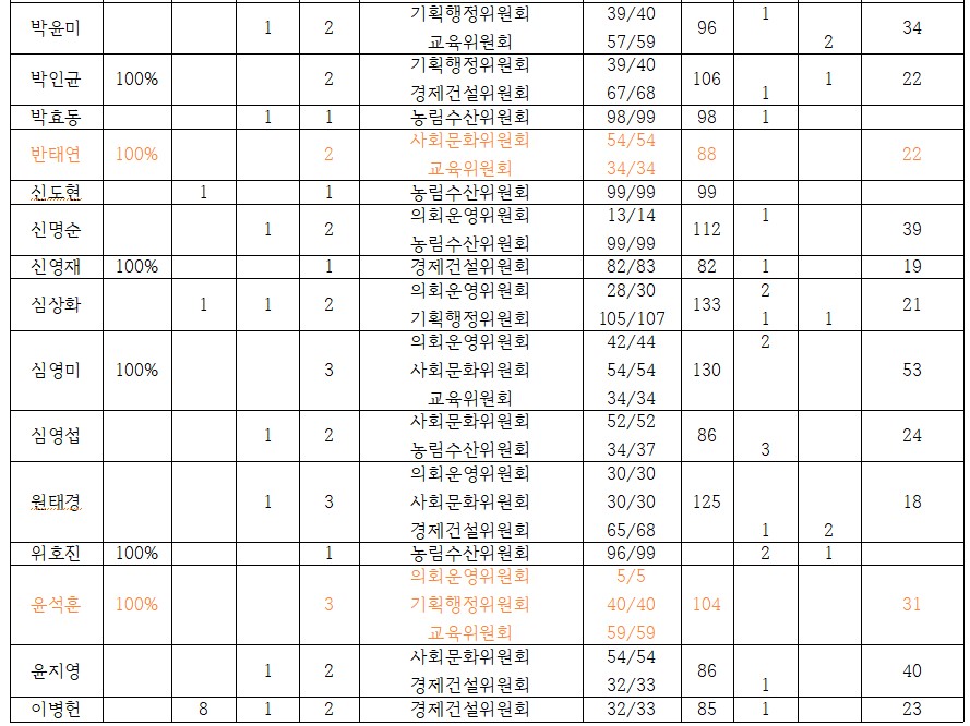 100% 출석률을 보이면서 3개이상의 운영위에서 활동을 하며, 안건발의(평균 20건)를 30건 이상 한 의원은 윤석훈(평창1)의원과 정수진(비례대표)의원인 것으로 나타났다. 윤석훈(평창1)의원은 의회운영위원회, 기획행정위원회, 교육위원회에서 활동하며 104회의 회의에 100% 출석했고, 조례발의안 등 31회의 안건을 발의 했다. 정수진(비례대표)의원은 의회운영위원회, 사회문화위원회, 농림수산위원회에서 활동하며 105회의 회의에 100% 출석했고, 조례발의안 등 38회의 안건을 발의 했다. 윤석훈 의원과 정수진 의원은 다양한 운영위에서 다각도로 도의 현안을 살피는 것은 물론 성실함으로 의정활동을 펼친 결과, 주민들을 위한 조례 제정을 30건 이상 발의 해 강원도의회의 평균 안건발의를 웃도는 성과를 냈다.