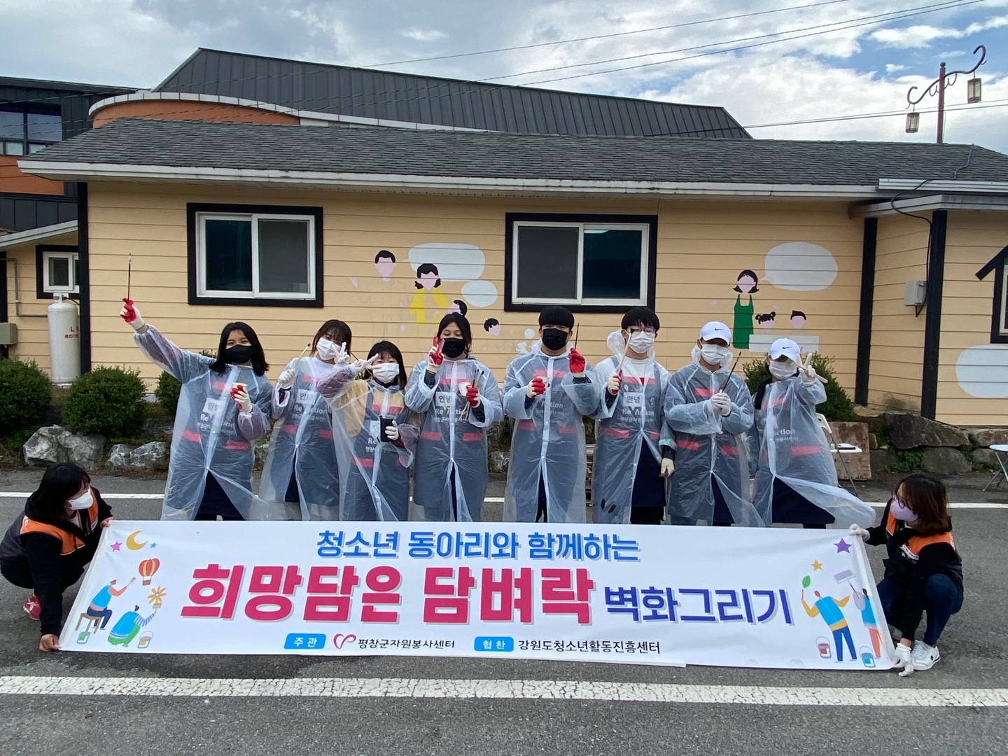 평창군자원봉사센터(센터장 이은미)는 봉평 메밀꽃축제장 일대에서 봉평고등학교 청소년 동아리 ‘다솜’과 함께 ‘희망 담은 담벼락’ 벽화 그리기 자원봉사 활동을 펼쳤다.