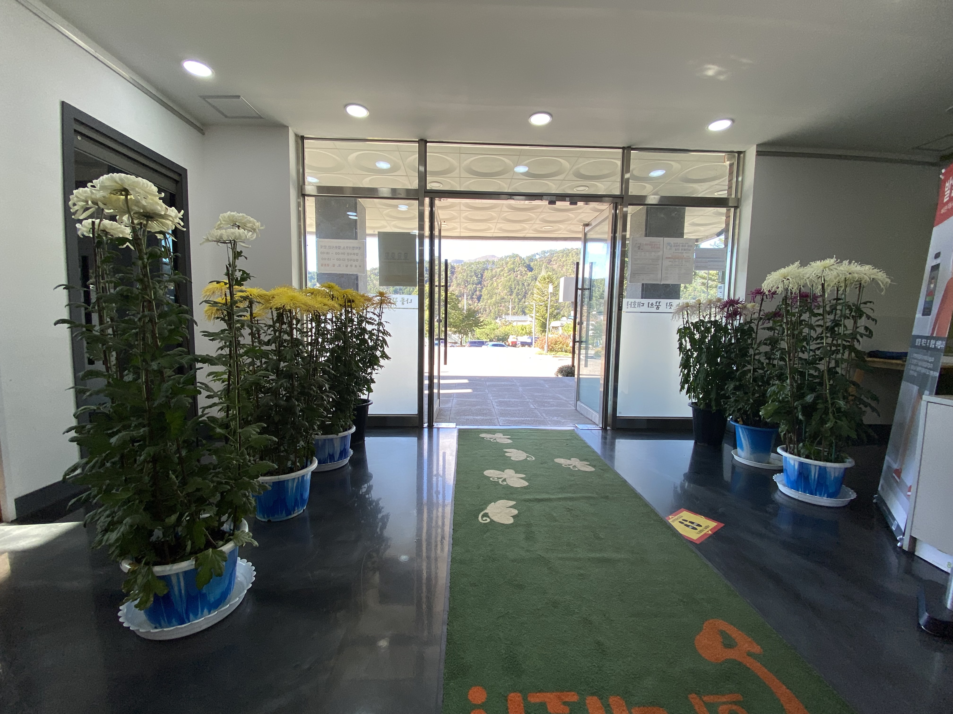 평창군 대화면사무소(면장 이용화)에서는 신1리에 거주하고 있는 주민 전오현 씨가 대화면사무소에 직접 키운 국화 꽃화분을 기증해 면사무소를 환하게 밝혀주고 있다.