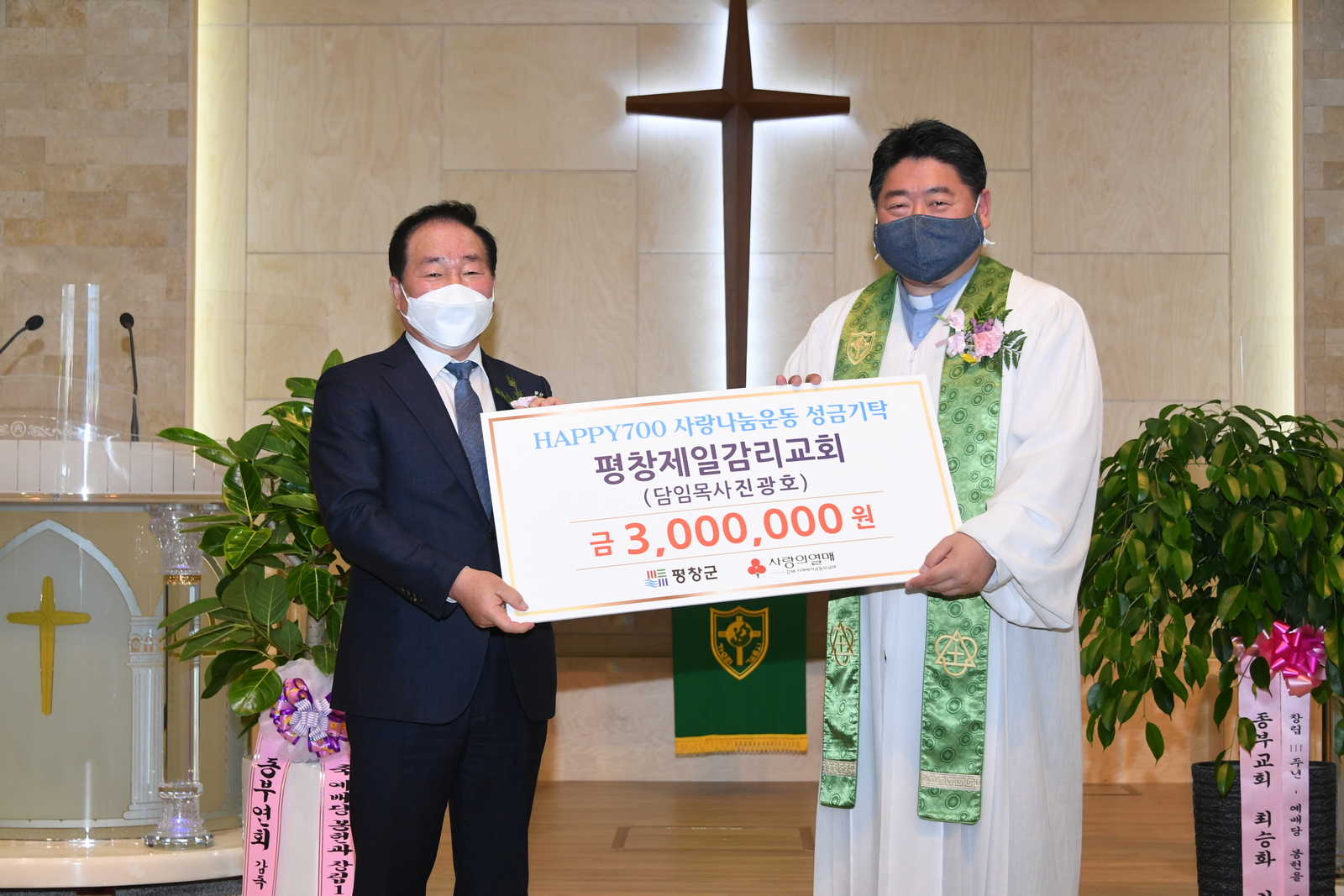 - 지난 24일, 평창제일감리교회(담임목사 진광호)는 교회 창립 111주년 기념 봉헌예배를 대예배실에서 갖고, 평창군 HAPPY700 사랑나눔운동에 성금 300만원을 기탁하였다.