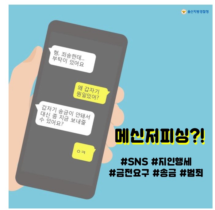 위 사례는 최근 기승을 부리고 있는 메신저피싱 수법으로, 불법으로 취득한 타인의 메신저 아이디로 로그인한 뒤 등록된 가족⋅지인에게 메시지를 보내 개인정보나 금전을 요구하는 행위를 말한다.