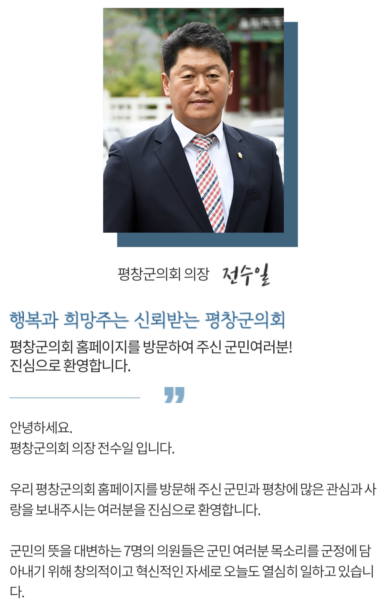 그동안 봉평지역사회 발전과 군정의 원활한 운영을 위해 고군분투 하시던 평창군의회 의장이신 전수일님께서 금일 오전10시경 운명을 달리하셨음을 알려드리오며,아래내용과 같이 일정을 공지하오며 삼가 고인의 명복을 비옵니다.