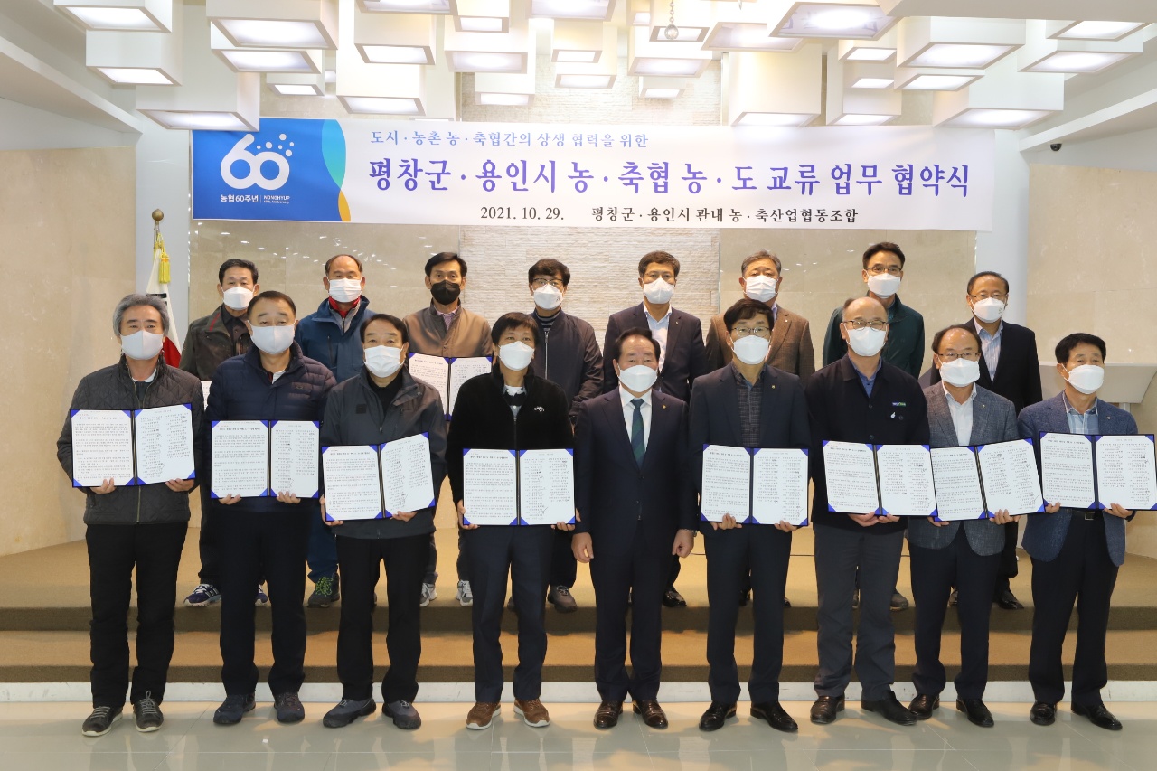농협평창군지부(지부장 최두헌)와 관내 7개 농·축협과, 용인시지부(지부장 이의도)와 관내 10개 농협은 농업·농촌의 가치 제고와 농업발전에 기여하기 위하여 도·농 교류 업무 협약식을 한왕기 평창군수와 농협 평창·용인 지부장 및 조합장들이 참석한 가운데 농축협 간 상호 유기적인 협력체계 구축과, 농업·농촌의 가치를 제고를 통한 농업인의 소득을 향상을 위한 협약식을 가졌다.