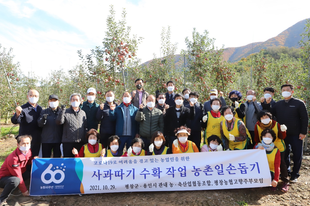 또한 평창군·용인시 농협 조합장과 평창군농업기술센터, 평창농협고향주부모임 등 40명은 종부리 사과 재배 농장(남부기 농업인)에서 합동 일손돕기을, 실시하였으며, 용인시 농협 조합장들은 이날 수확한 사과 50여 박스을 구매하고