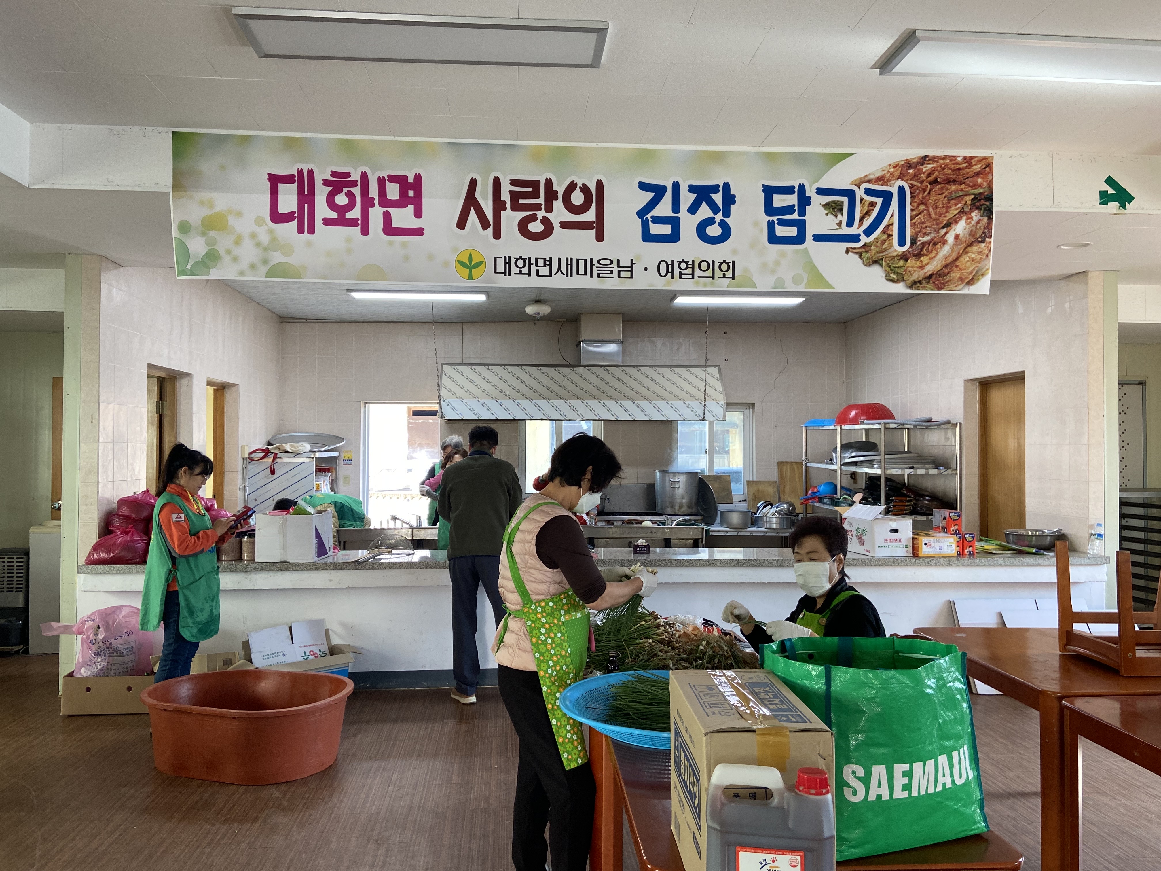 2일, 대화문화체육관에서는 이른 아침부터 남녀새마을지도자협의회를 비롯하여 대화면사무소, 번영회, 체육회 등 각 사회단체장들이 참여한 가운데 이틀에 걸쳐 배추절임부터 양념까지 직접 배추김치 500포기를 담가 28개리 마을에 전달하고, 마을에서 취약계층 가구를 방문해 추운 겨울을 잘 이겨낼 수 있도록 따뜻한 마음을 함께 전달하였다.