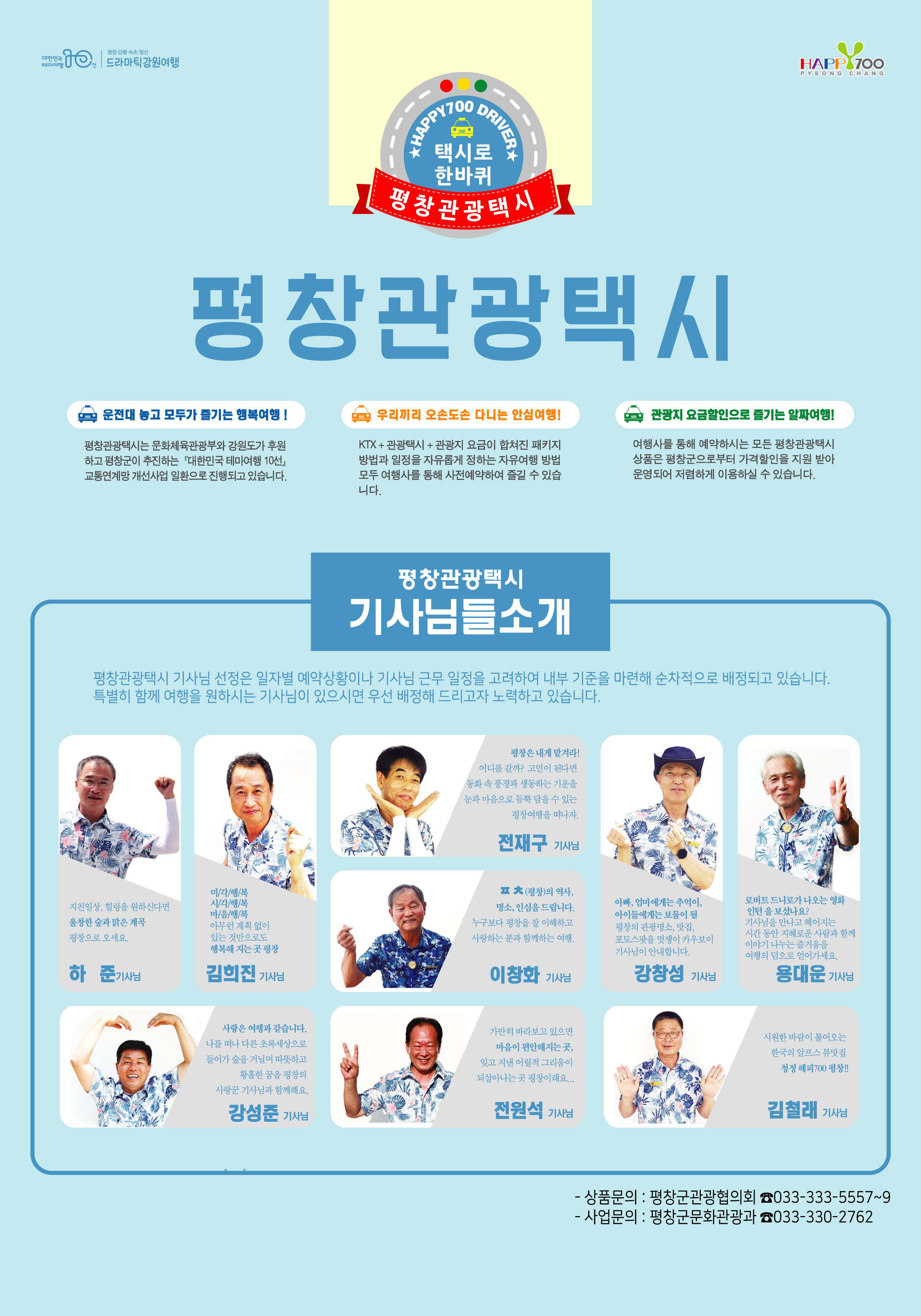 또한, 평창관광택시는 운행거리에 따라 요금을 징수하는 일반택시와 달리 이용한 시간만큼 이용요금을 지불하는 형태로 개별관광 자유여행객들에게 호응을 얻고 있는 가운데 평창관광 택시패스는 관광객의 여행 자유도를 높이는 계기가 될 전망이다.