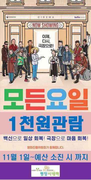 이번 사업은 문화체육관광부와 영화진흥위원회가 함께하는 2021년 전국 영화관 입장료 할인권 사업으로, 영화관 관객은 요일에 상관없이 1천원으로 영화를 볼 수 있다.