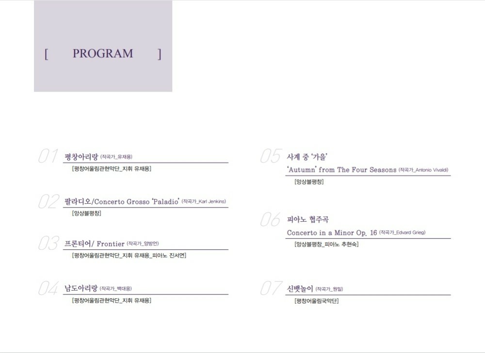 연주곡목을 보면 국내곡 ‘평창아리랑서곡’, ‘프론티어’, ‘진도아리랑’, ‘신뱃놀이’, ‘인연’, ‘아리랑판타지’, ‘아름다운 나라(평창)’등 7곡과 외국곡 ‘팔라디오(Concerto Grosso ‘Paladio)’, 비발디 4계 중 ’가을‘, ’그리그 피아노협주곡 op.16‘, 오페라 ’라 트라비아타‘ 中’축배의 노래‘, ’월량대표아적심’ 등 총 12곡이 연주된다.