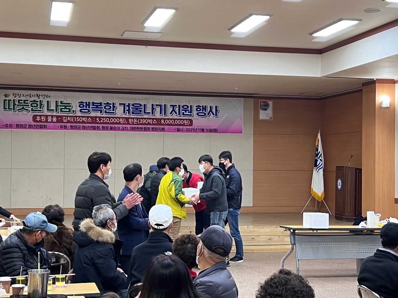 평창군 청년영합회는 김장철을 맞이하여 평창군 지역자활센터에 김치와 돼지고기를 전달하는 행사를 진행했다.