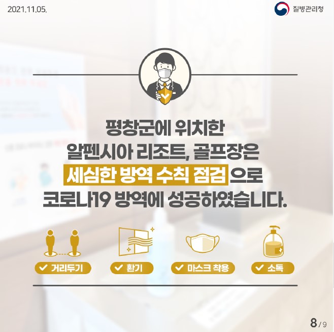 8월 알펜시아 용역사 직원 감염 발생 시에는 알펜시아 직원 전원 KF94 마스크 상시 착용, 주기적 환기 및 소독, 직원식당 칸막이 설치, 1회당 직원식당 이용 인원 조정, 직원 방역 사각지대(휴게공간) 관리 등의 개선을 통해 지역사회 확산예방에 최선을 다한 결과 질병관리청에서 선정한 코로나19 감염증 대응 우수사례 3건 중 평창군이 2건이나 선정되었다.