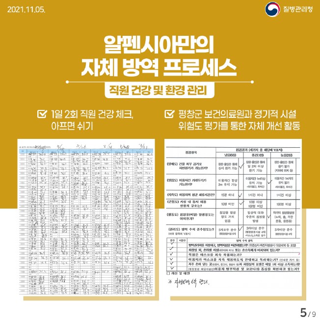 8월 알펜시아 용역사 직원 감염 발생 시에는 알펜시아 직원 전원 KF94 마스크 상시 착용, 주기적 환기 및 소독, 직원식당 칸막이 설치, 1회당 직원식당 이용 인원 조정, 직원 방역 사각지대(휴게공간) 관리 등의 개선을 통해 지역사회 확산예방에 최선을 다한 결과 질병관리청에서 선정한 코로나19 감염증 대응 우수사례 3건 중 평창군이 2건이나 선정되었다.