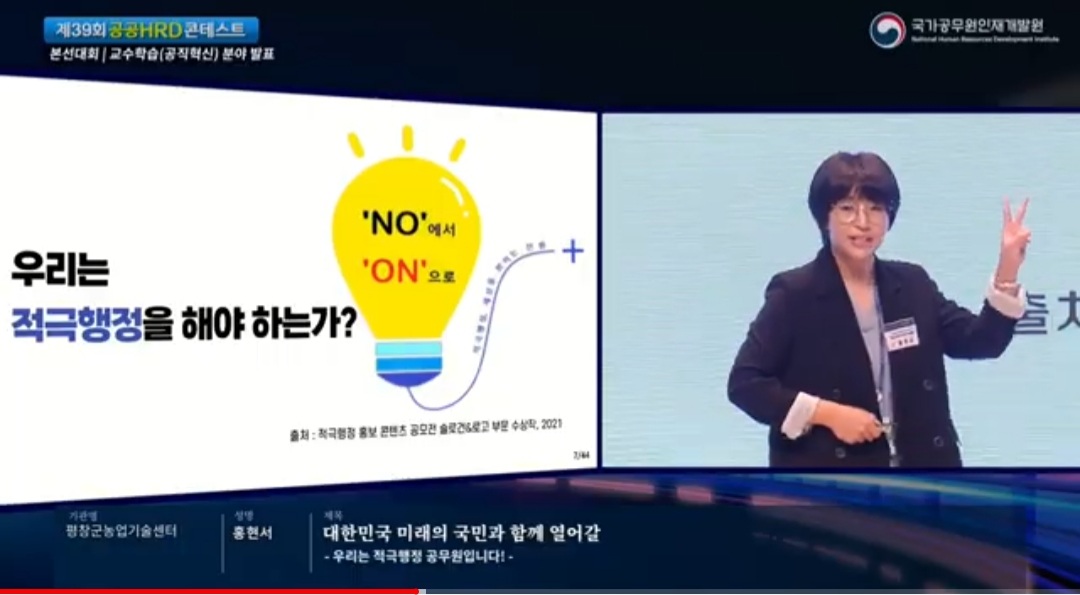 홍현서 농촌지도사는 대한민국의 미래를 국민과 함께 열어갈, 우리는 적극행정 공무원입니다!’라는 주제로 신규 공직자들을 위해 눈높이에 맞춰 적극행정의 공감을 이끌어내고 다양한 교수기법을 활용하여 흥미로운 강의를 진행하여 심사위원들의 높은 평가를 받았다.