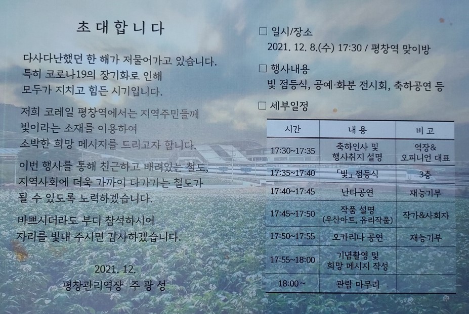 행사는 12월 8일 17시 30분 평창역 맞이방에서 진행될 예정이다.
