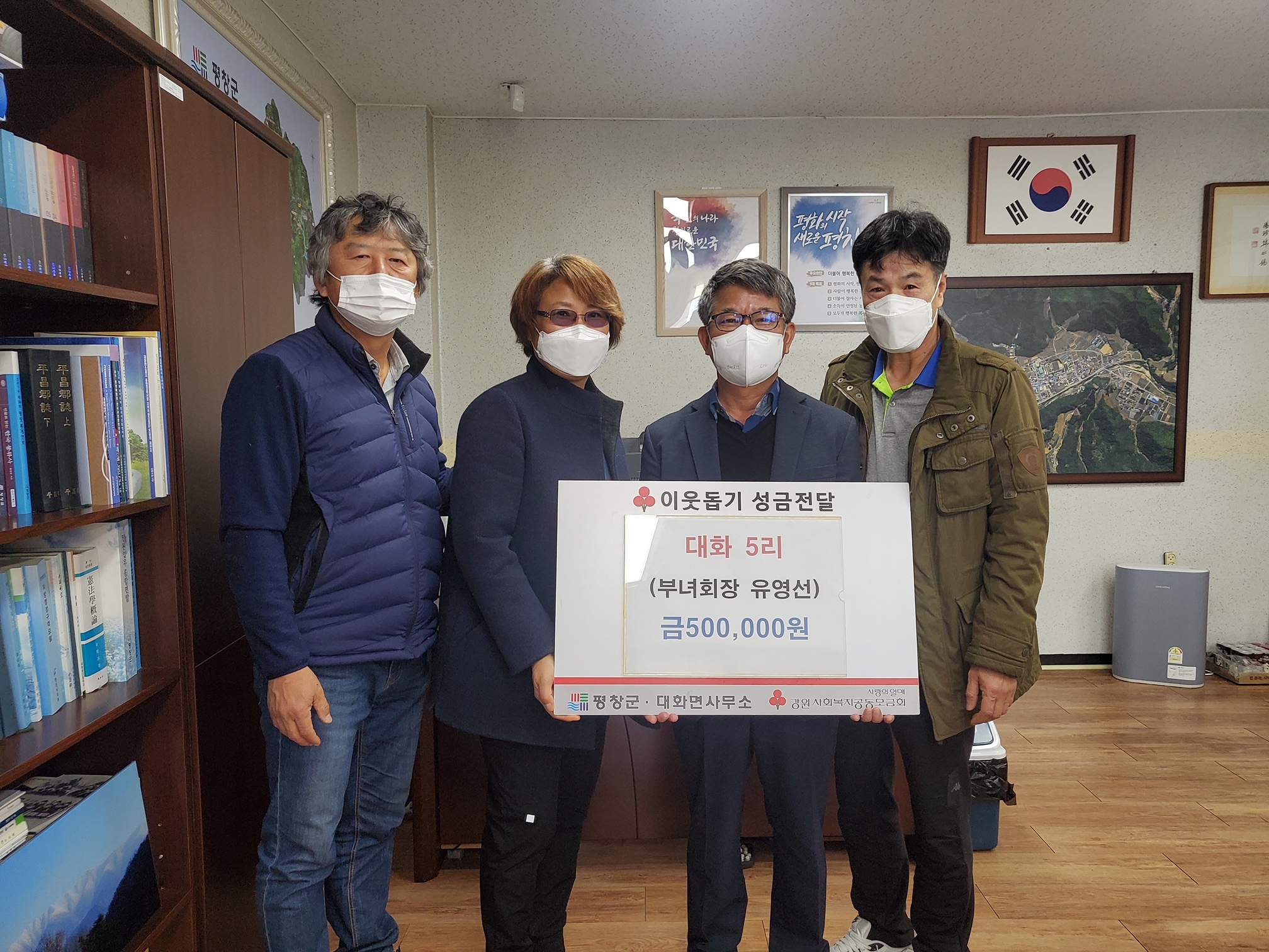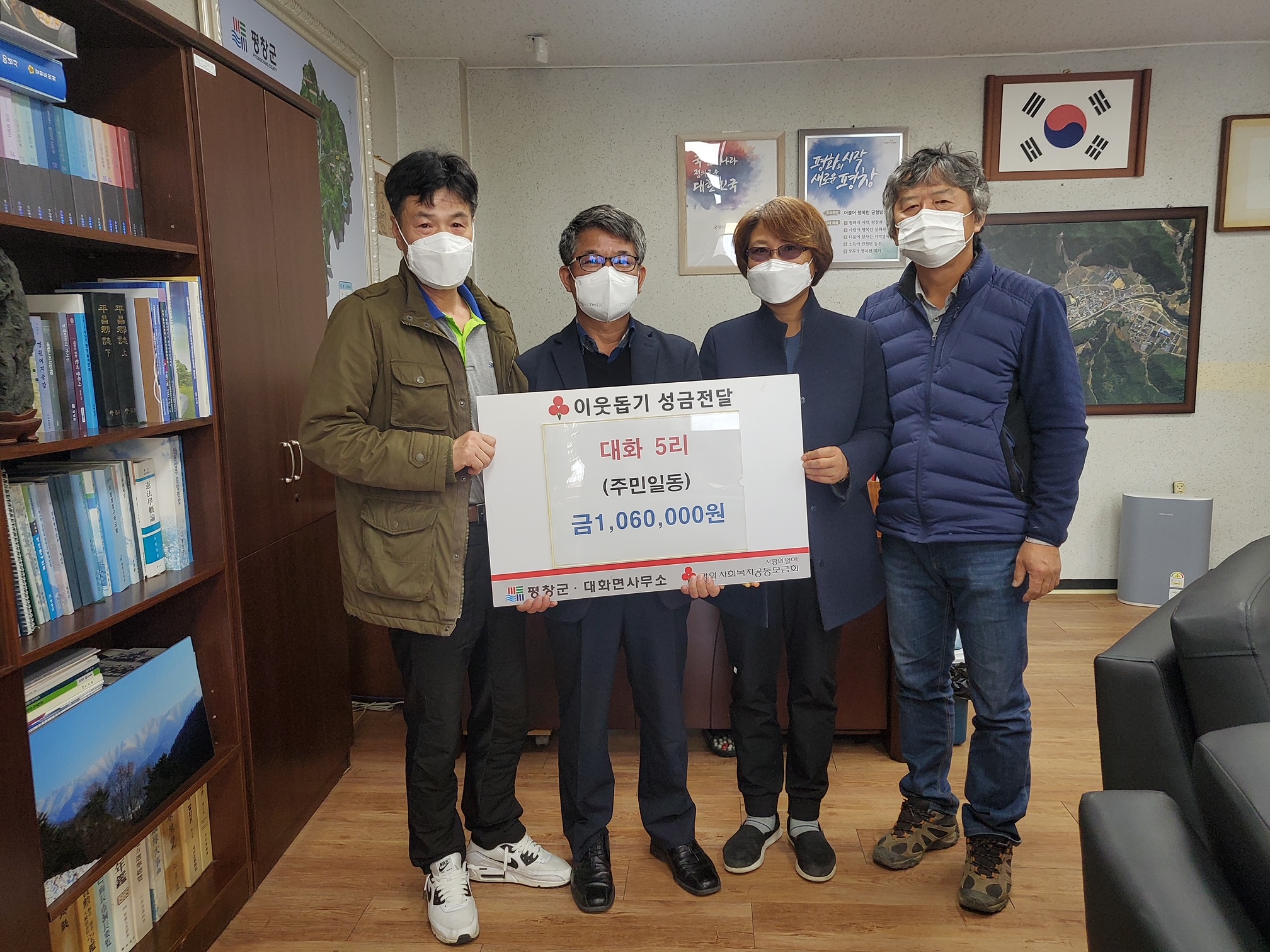 평창군 대화면사무소(면장 이용화)는 12월 1일, 대화5리(이장 함승호) 마을 주민들이 면사무소를 방문하여 우리 지역의 어려운 이웃을 위한 불우이웃성금 156만원을 전달했다고 밝혔다.