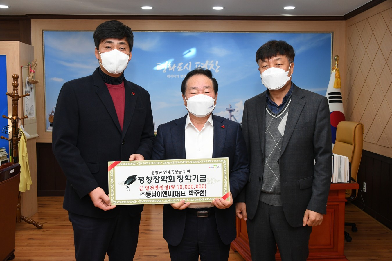 ㈜동남이엔씨(대표 박주현)은 6일 평창군수실을 방문하여 (재)평창장학회에 장학기금 1천만 원을 기탁하였다.