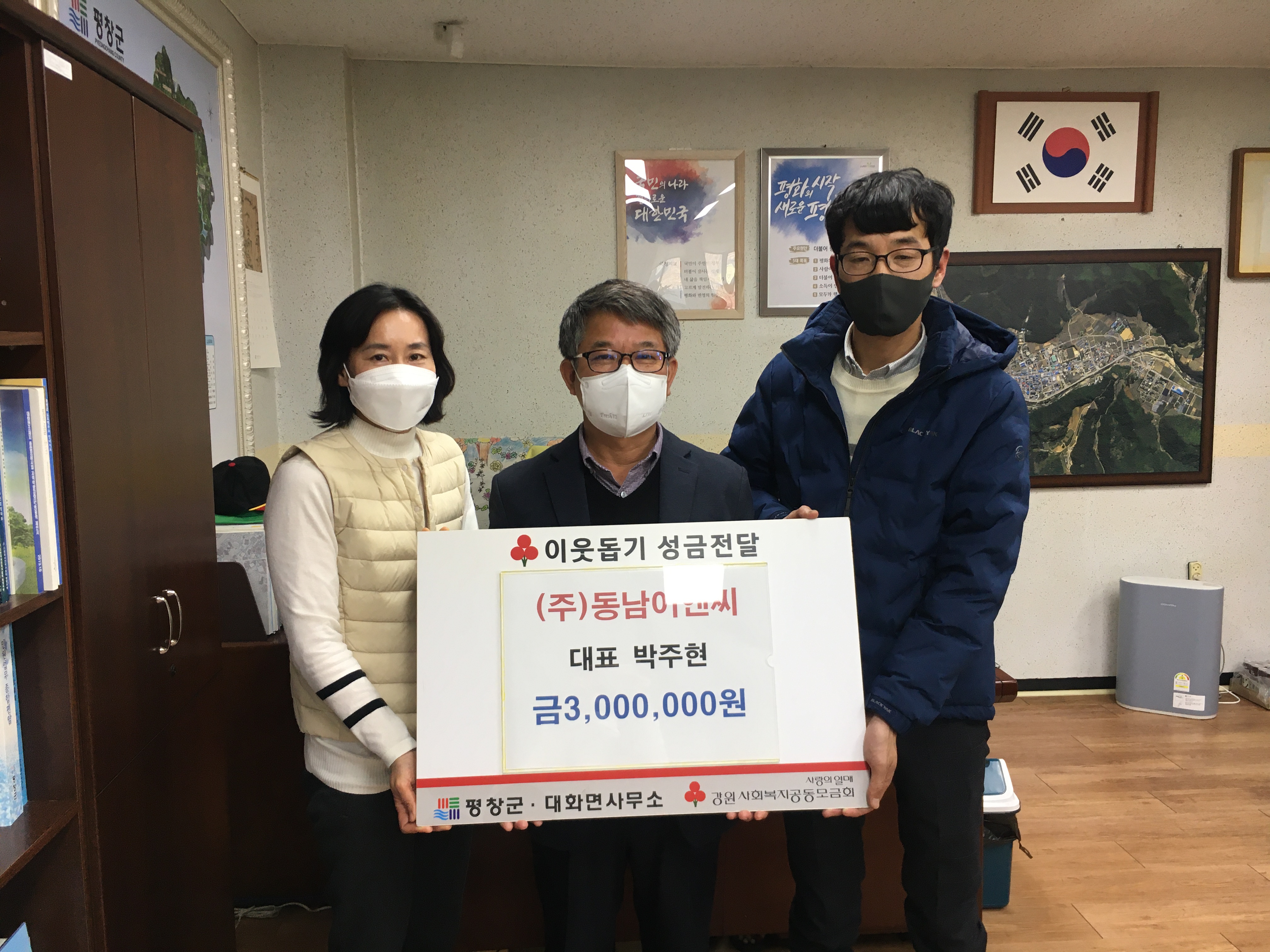 ㈜동남이엔씨는 매년 소외된 이웃을 위해 기부해오고 있으며 2019년에는 305만원, 2020년 300만원씩 전달하고 있고 대화면뿐만 아니라 평창군에 도움이 필요한 곳에도 봉사활동을 하는 등 다양한 손길로 사회에 귀감이 되고 있다.