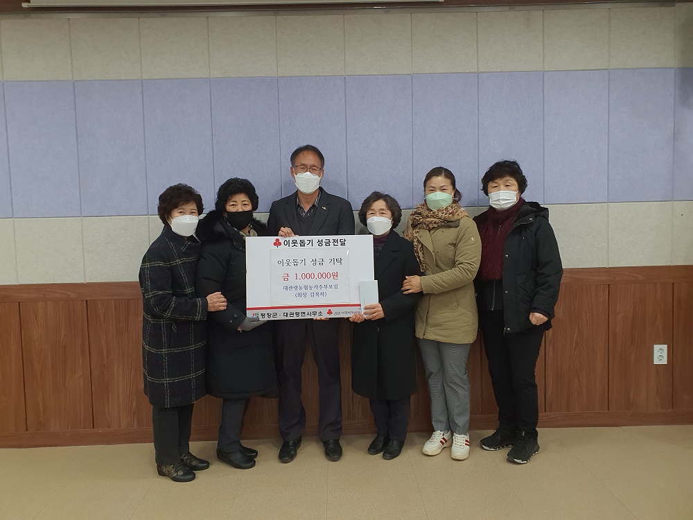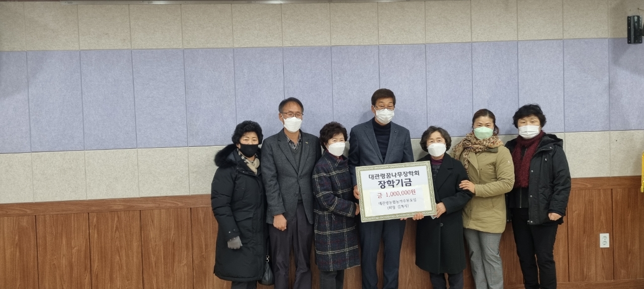 12월 7일 대관령농협 농가주부모임(회장 김복자)는 대관면사무소를 방문하여 관내 취약계층 지원을 위한 이웃돕기 성금 1백만 원을 기탁하였으며, 스키꿈나무 인재 육성을 위해 사용해달라며 대관령꿈나무장학회에도 장학금 1백만 원을 기탁하였다.