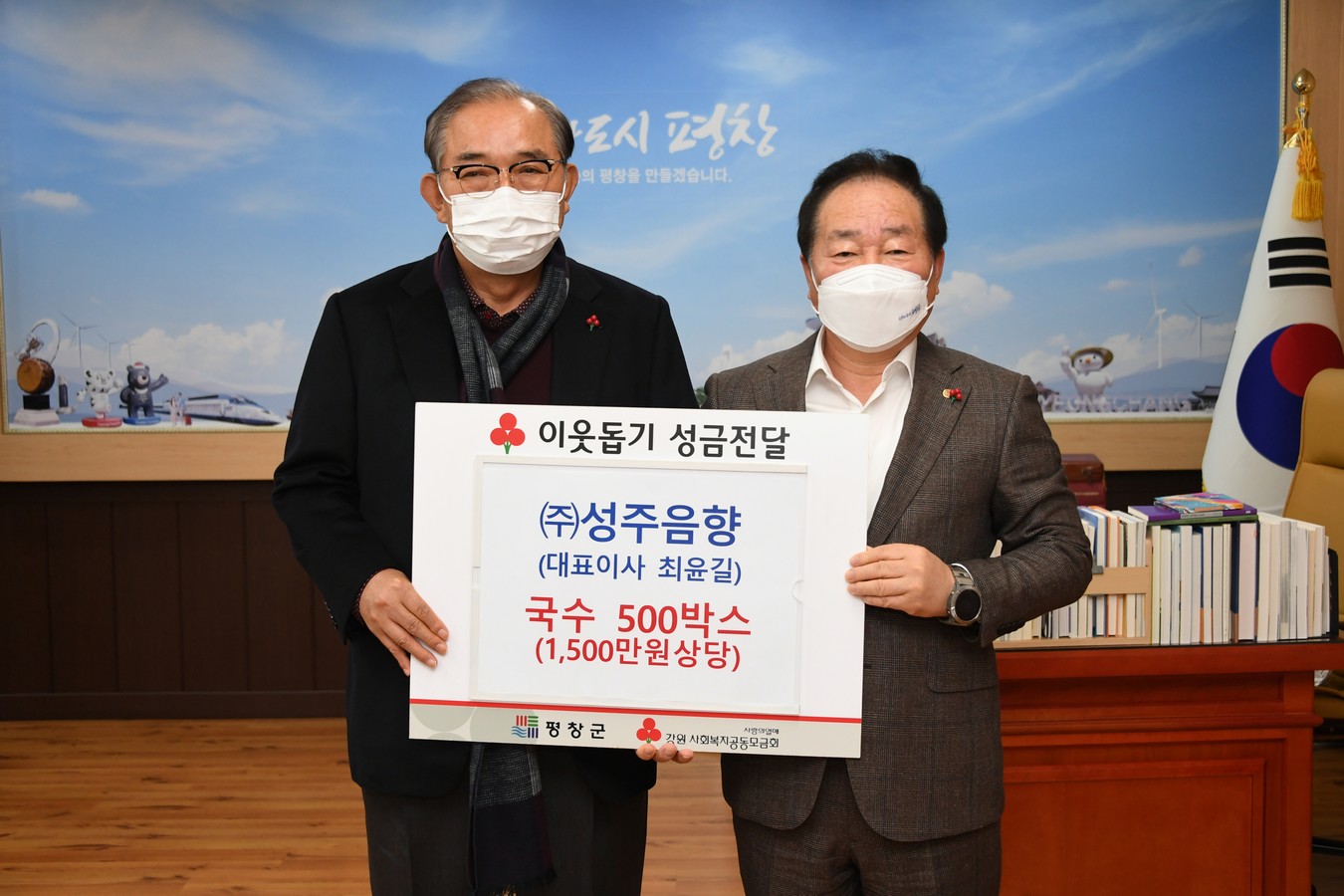 ㈜성주음향 최윤길 대표이사는 평창군 출신 기업인으로 2016년 국수 450박스 기부를 시작으로 최근 5년간 고향 어르신들을 위해 국수 2,450박스(7,400만원 상당)을 기탁 했으며, 지난달에는 어르신들을 위해 마스크 3만장 기탁에 이어 다시 한 번 국수500박스를 기탁했다.