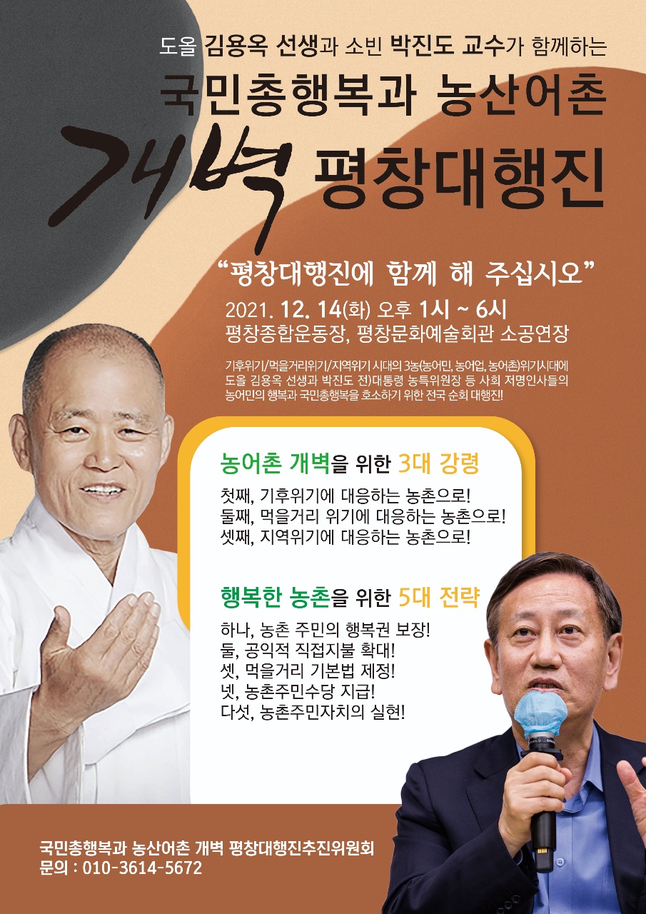 12월14일(화요일) 오후1시부터 평창문화예술회관 소공연장에서 도올 김용옥선생과 박진도 농특위원장(전)과 함께 평창민회를 진행한다.