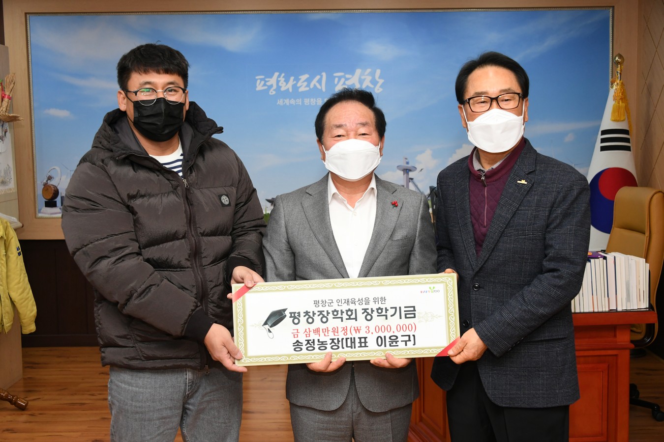16일 평창군청에서 새나배드민턴클럽(회장 정진욱)이 1백만원, 송정농장(대표 이윤구)이 평창장학회에 장학금 3백만 원을 기탁하였다.