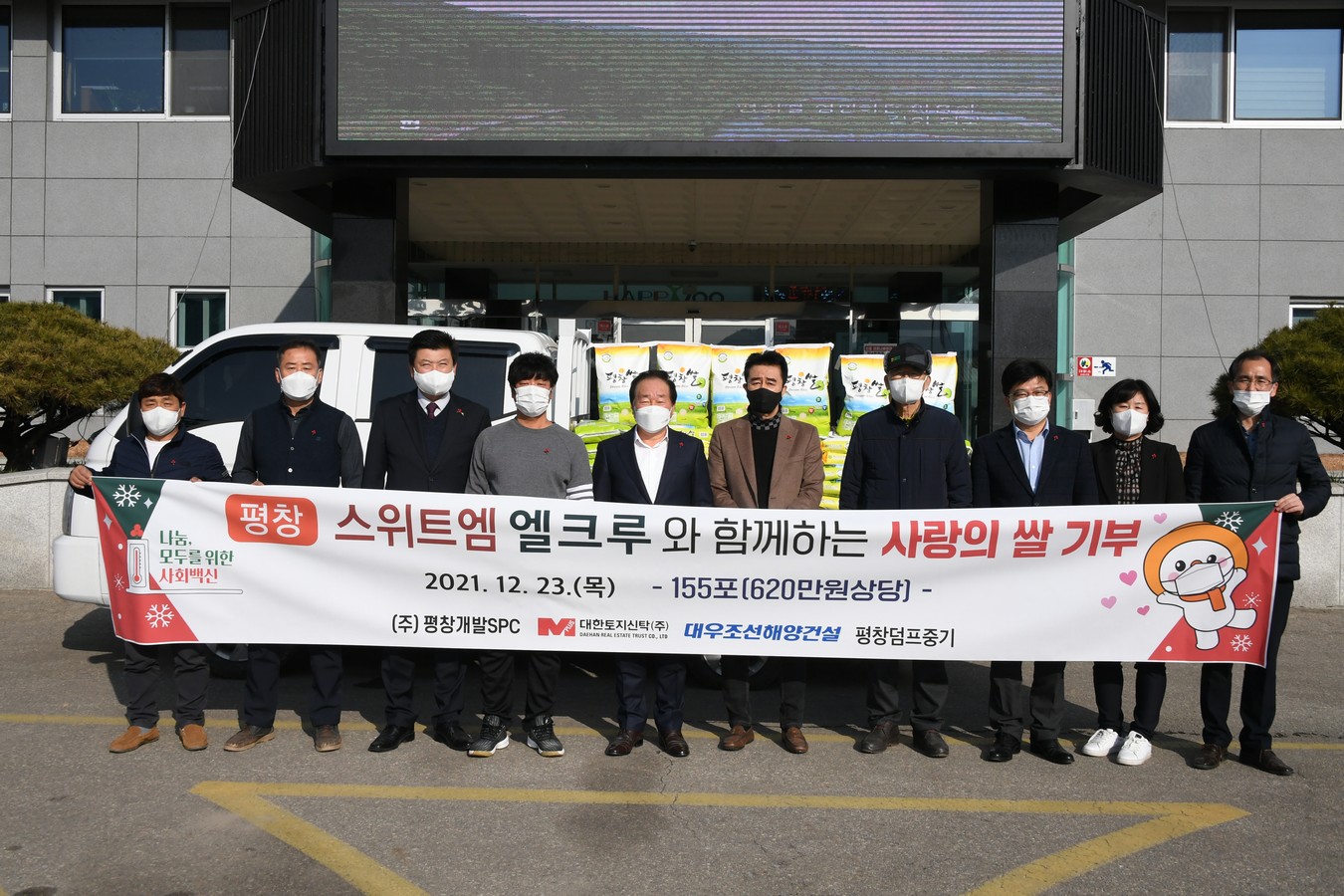 23일, 평창 스위트엠엘크루는 연말연시 「희망2022나눔캠페인」의 일환으로 어르신들을 위해 전달해달라며, 쌀 155포(620만 원 상당)을 기탁했다.