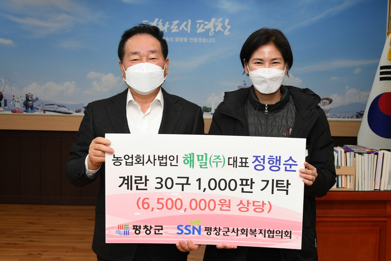 27일 농업회사법인 해밀(주) 대표 정행순은 군청을 방문해 2022희망나눔캠페인 이웃돕기 물품(650만원 상당 30구 달걀 1,000판)을 기탁했다.