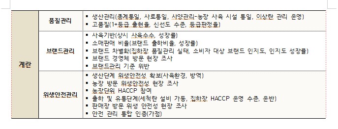 올해로 제18회를 맞이하는 우수 축산물브랜드 인증은 축산물브랜드의 지속적인 발전을 유도하고자 항목별 성장률을 평가하여 전년도 실적 대비 성장과 인증 심사 대상 브랜드의 평균 이상을 유지하도록 했고, 브랜드 실적의 현장 평가 강화를 위해 업무 담당자 인터뷰, 농장을 방문하여 방역 및 위생관리 현장 확인을 실시했다. 축산 관련 전문가 및 소비자로 구성된 인증 평가단이 시·도의 추천을 받은 축산물브랜드에 대해 인증 심사 항목별 실적을 확인한 결과를 토대로 인증위원회의 심의를 거쳐 최종 33개 브랜드를 우수 축산물브랜드로 선정했다.